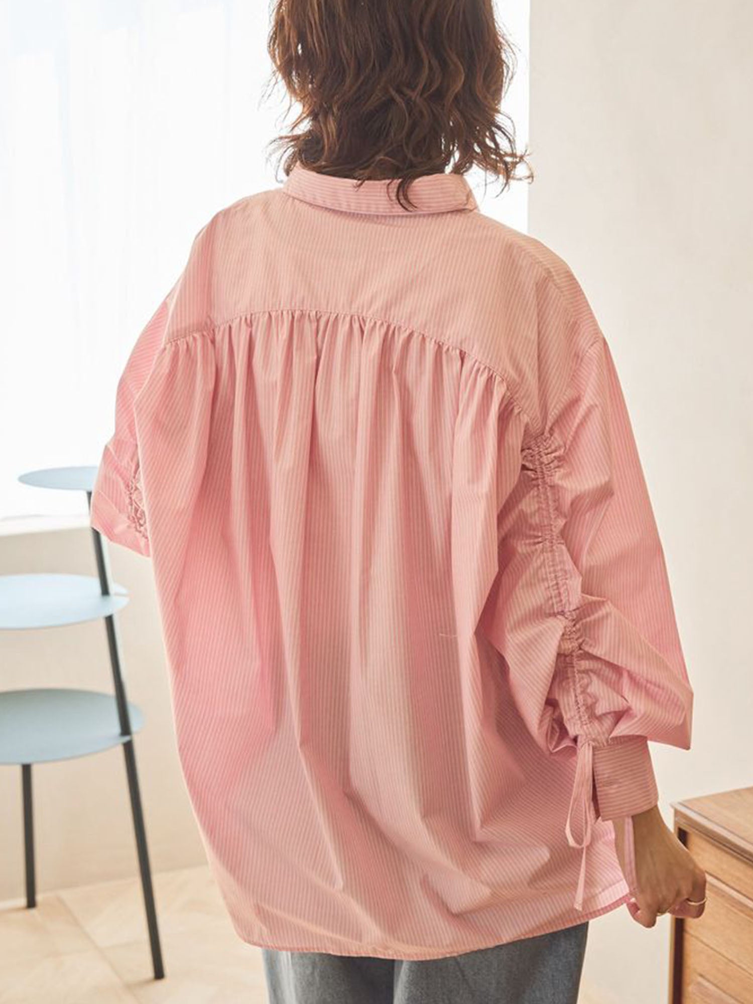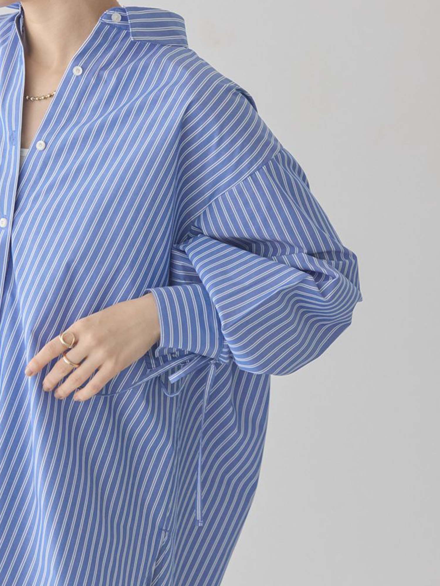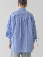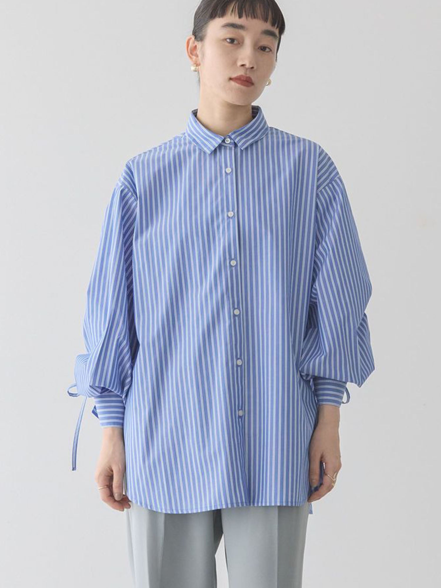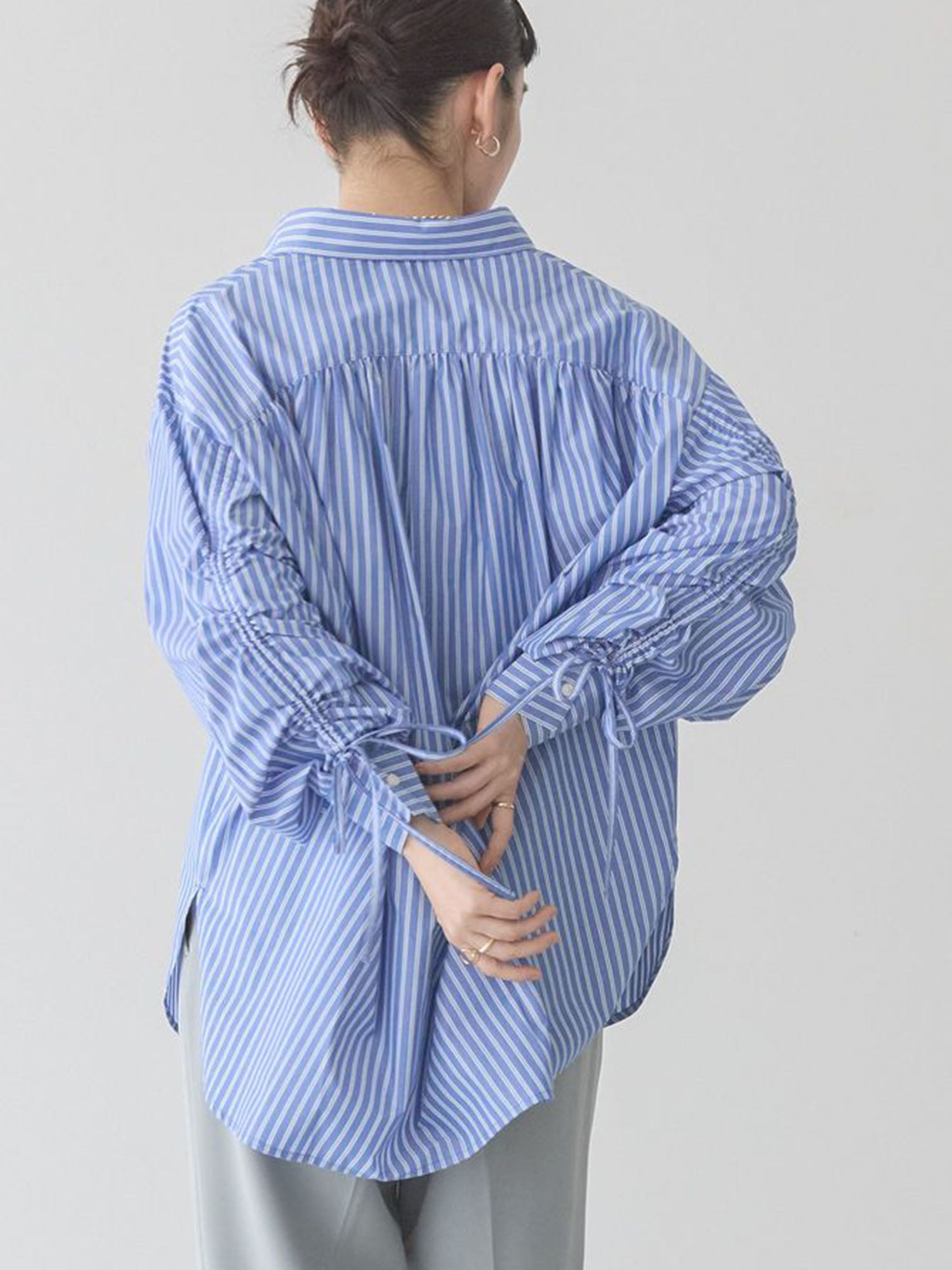 Kemeja stripe dengan siluet loose dan detail lengan serut yang dapat diatur dengan pita, memberikan tampilan yang unik dan feminin. Didesain dengan potongan asimetris di bagian hem dan lengan yang sedikit mengembang, blouse ini cocok untuk dipadankan dengan celana slim atau rok untuk tampilan effortless chic. Terbuat dari bahan polyester-cotton yang ringan dan nyaman untuk dikenakan seharian.
