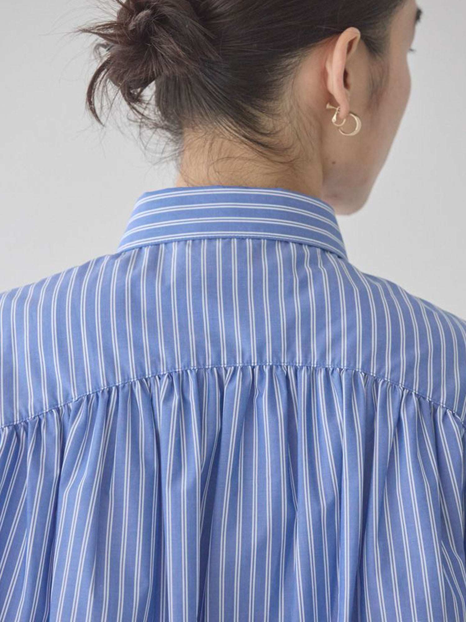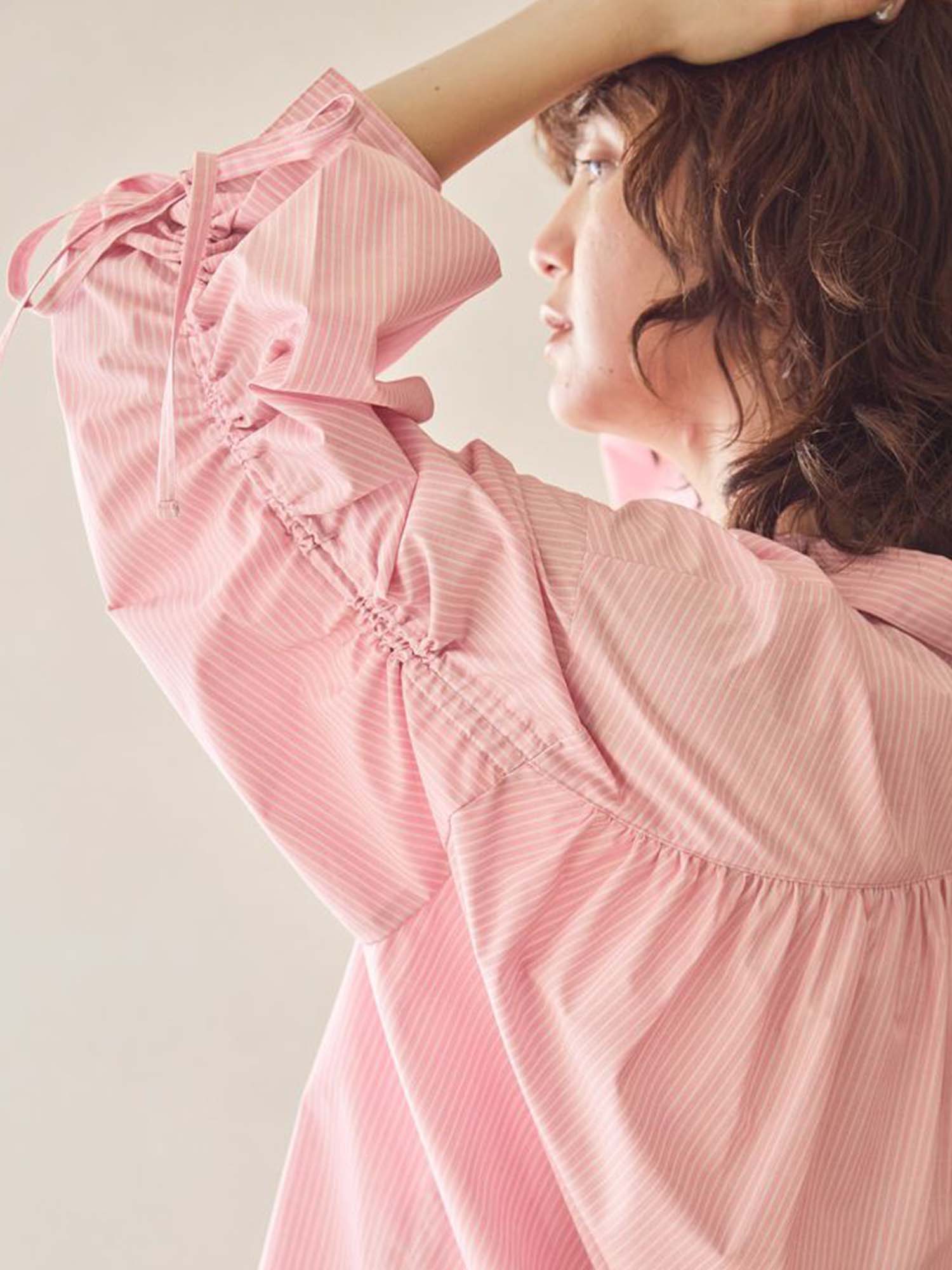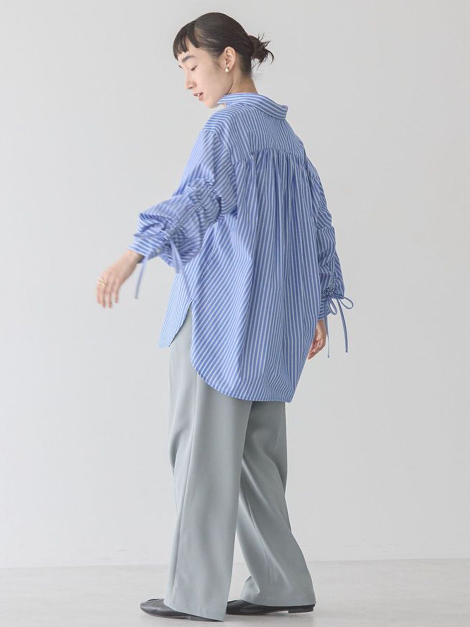 Kemeja stripe dengan siluet loose dan detail lengan serut yang dapat diatur dengan pita, memberikan tampilan yang unik dan feminin. Didesain dengan potongan asimetris di bagian hem dan lengan yang sedikit mengembang, blouse ini cocok untuk dipadankan dengan celana slim atau rok untuk tampilan effortless chic. Terbuat dari bahan polyester-cotton yang ringan dan nyaman untuk dikenakan seharian.