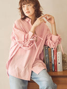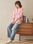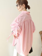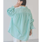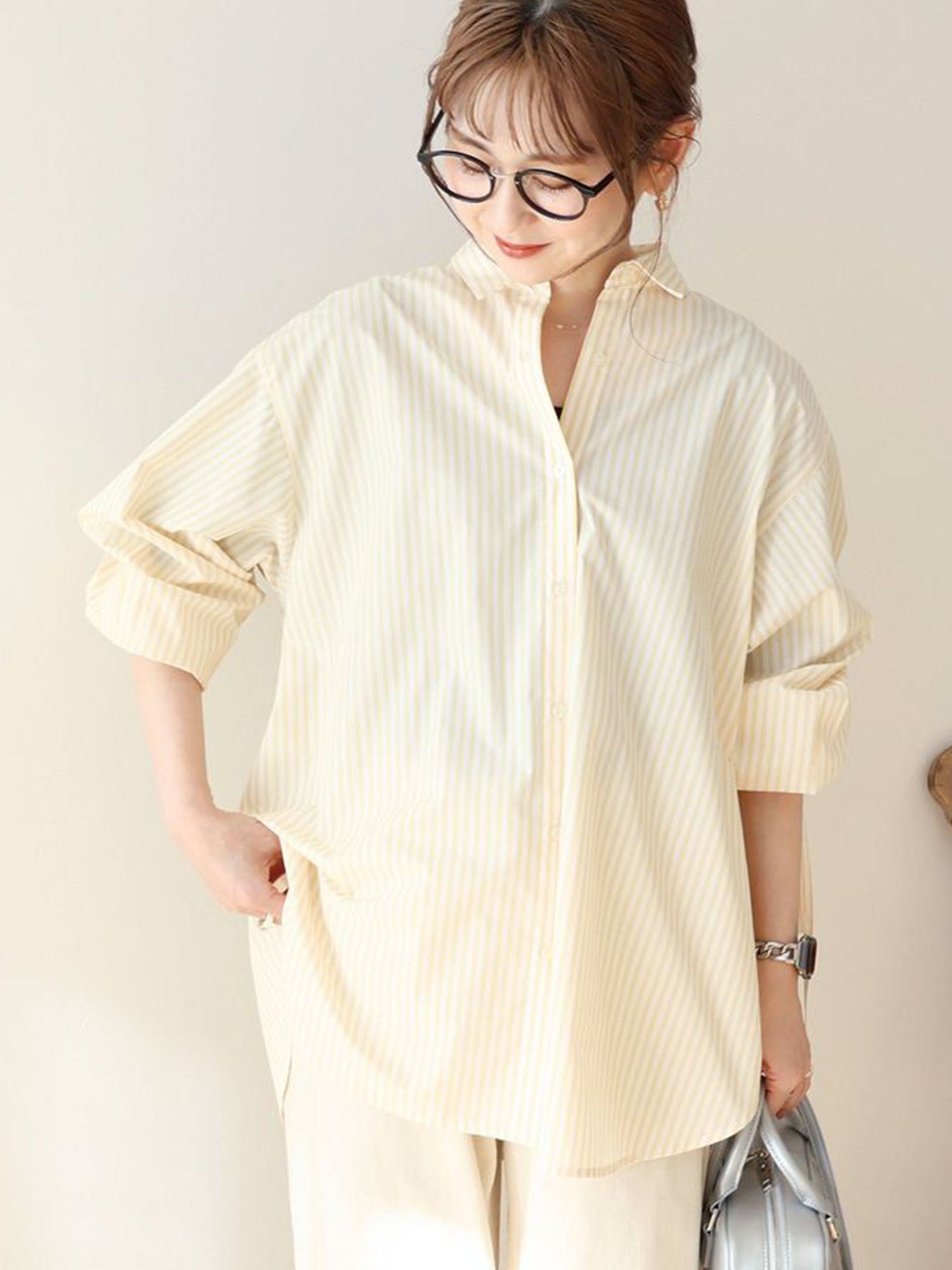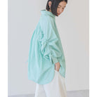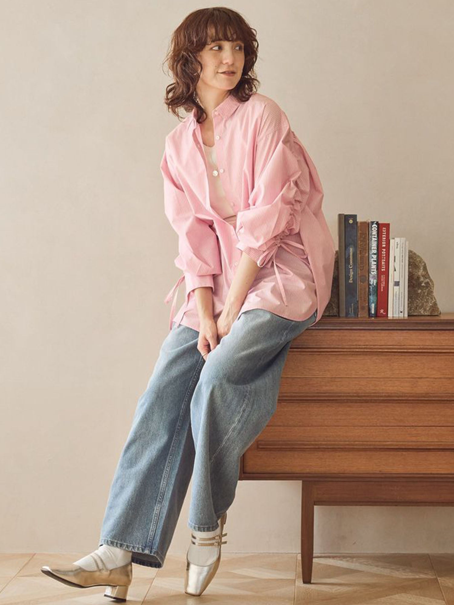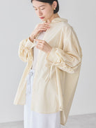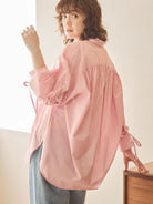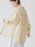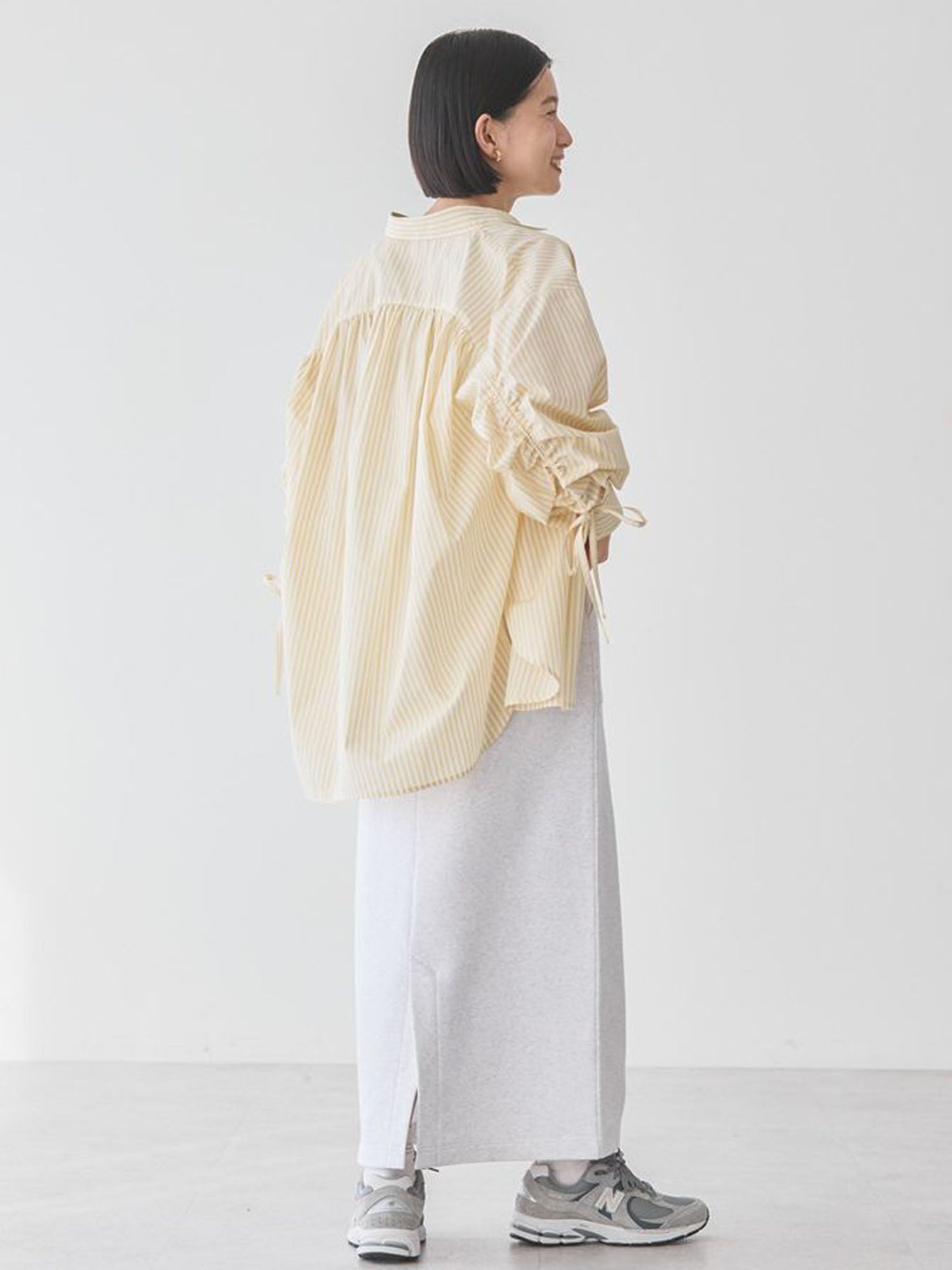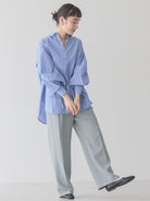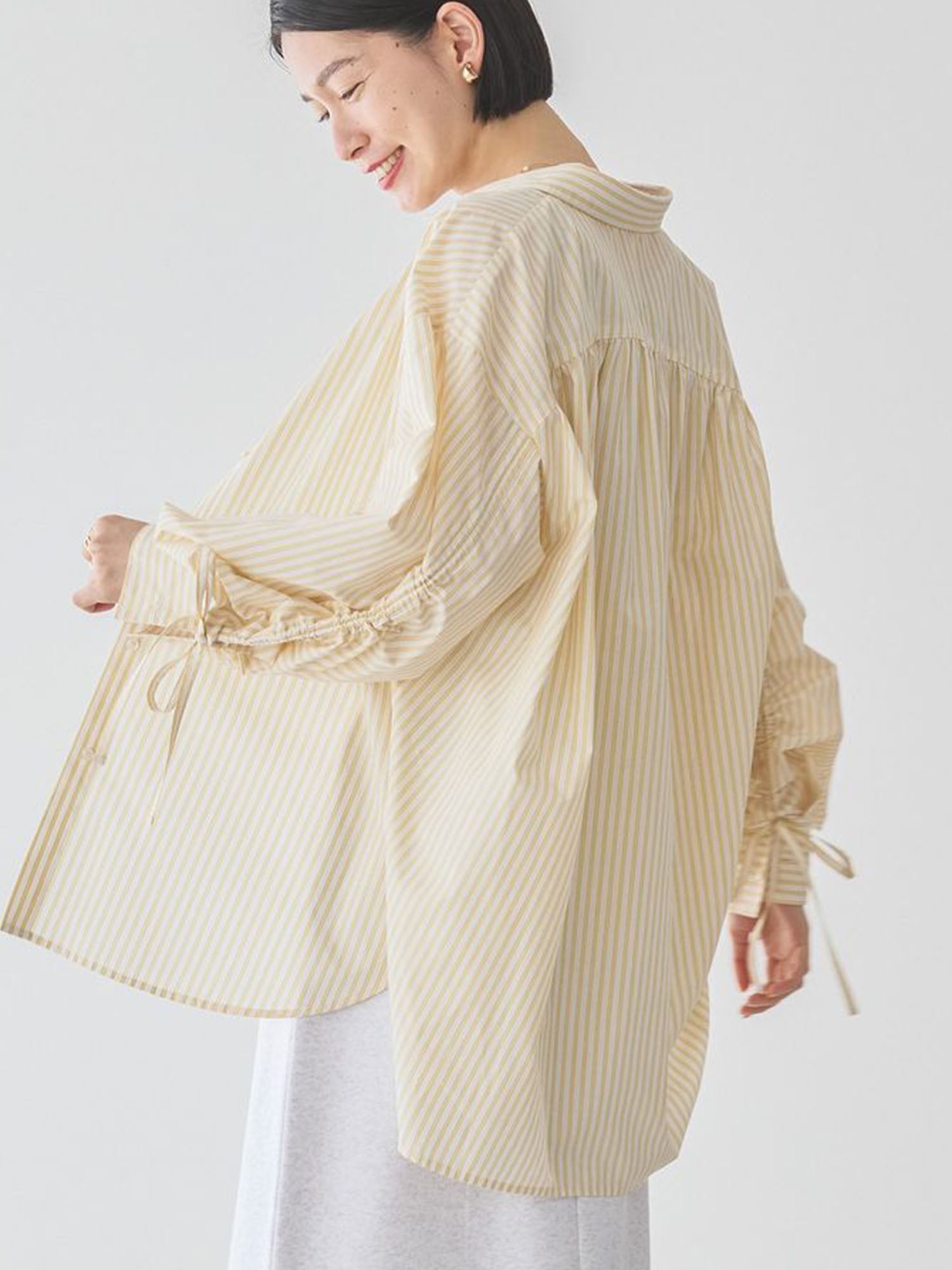 Kemeja stripe dengan siluet loose dan detail lengan serut yang dapat diatur dengan pita, memberikan tampilan yang unik dan feminin. Didesain dengan potongan asimetris di bagian hem dan lengan yang sedikit mengembang, blouse ini cocok untuk dipadankan dengan celana slim atau rok untuk tampilan effortless chic. Terbuat dari bahan polyester-cotton yang ringan dan nyaman untuk dikenakan seharian.