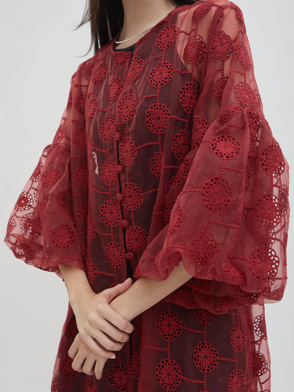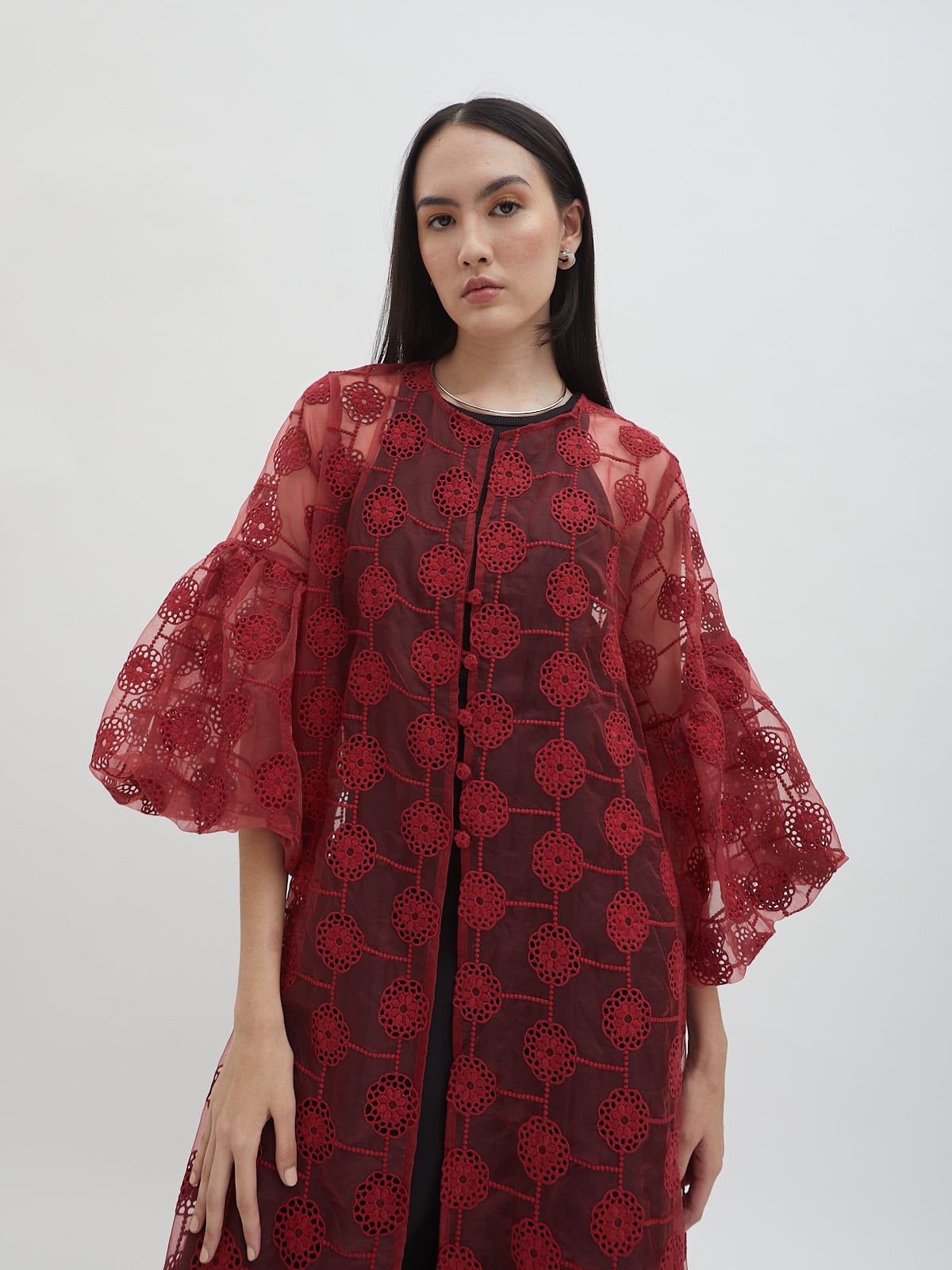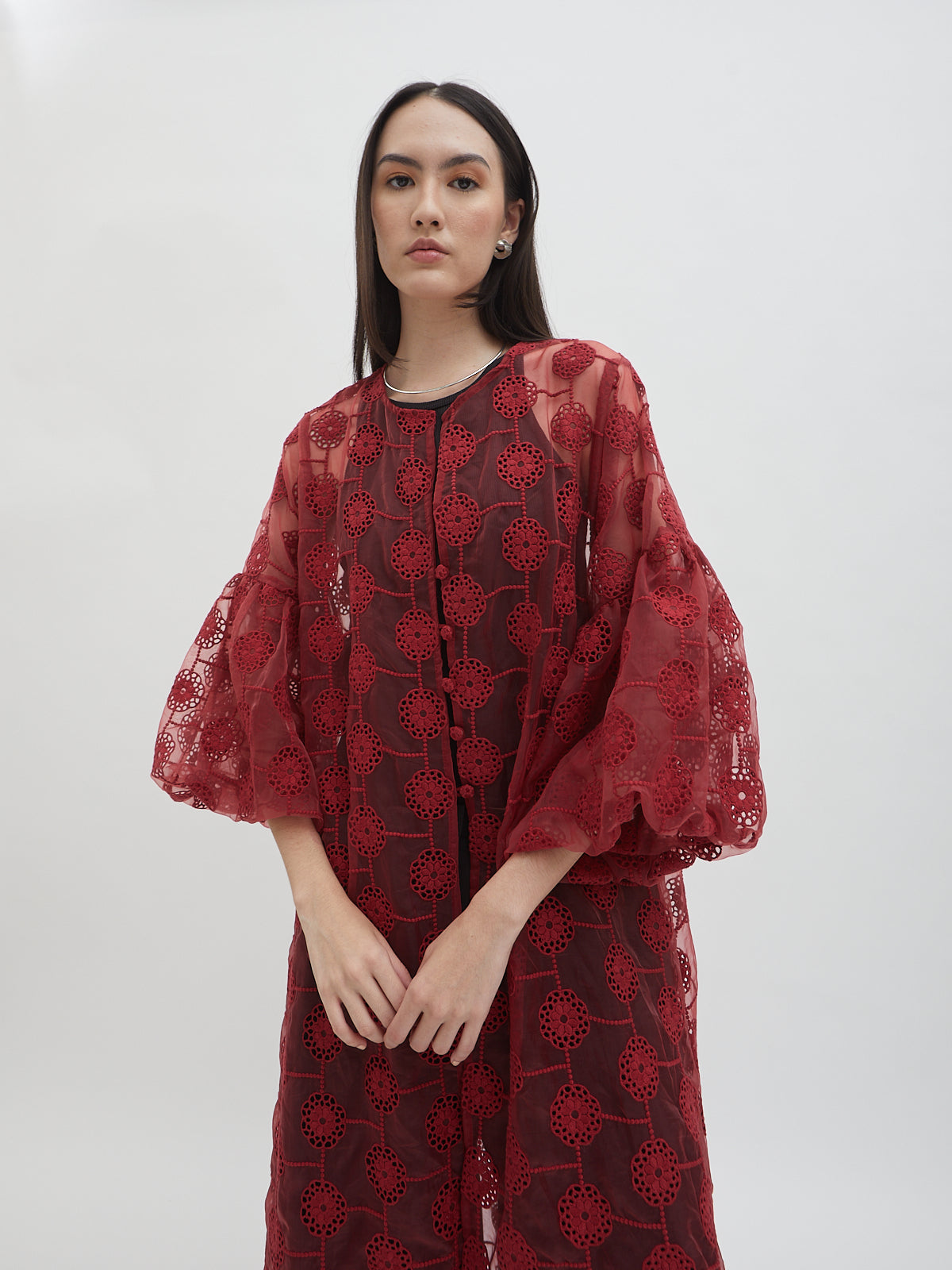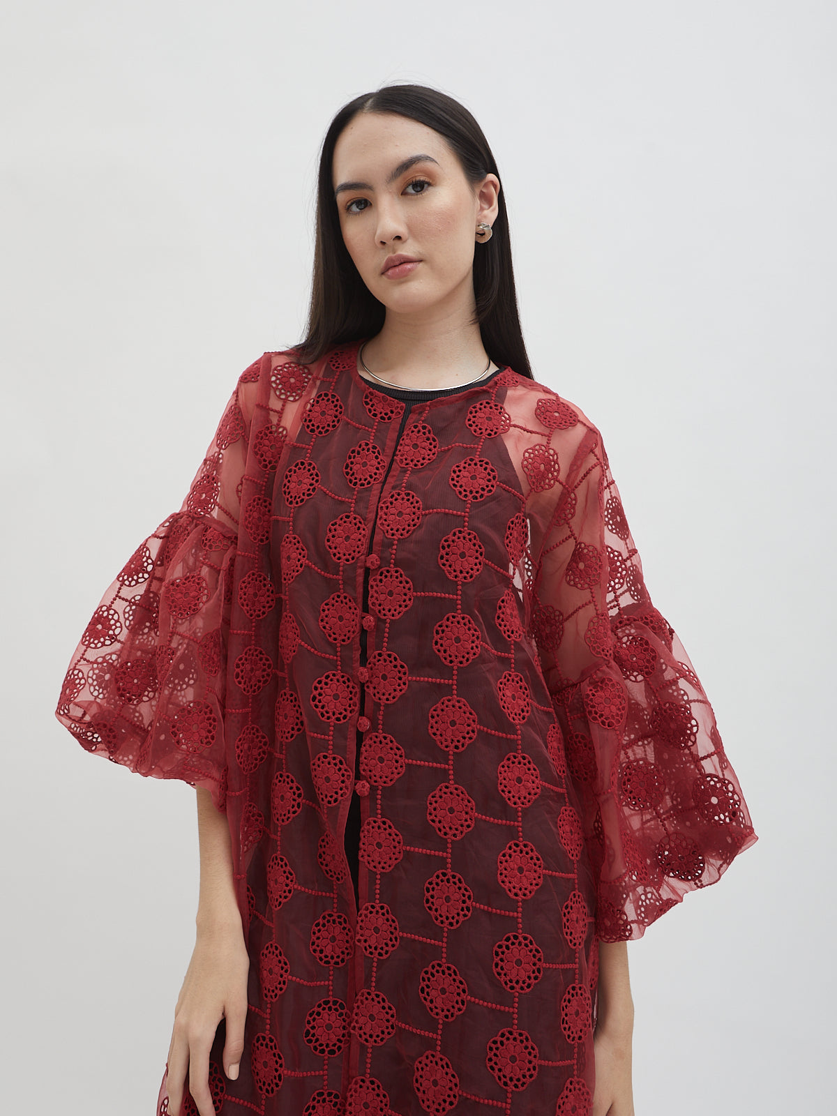 Lengan puff tiga perempat menambah kesan dramatis, sementara kancing depan membuatnya fleksibel untuk dikenakan terbuka atau tertutup. Tersedia dalam dua pilihan warna: Red dan Multi, cocok untuk berbagai gaya dan acara.