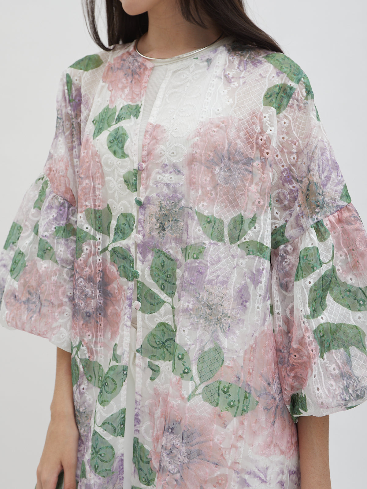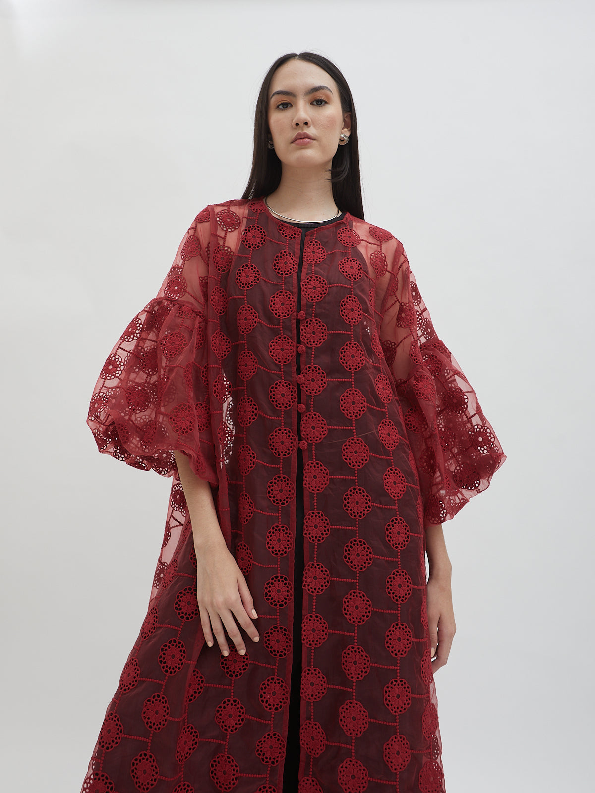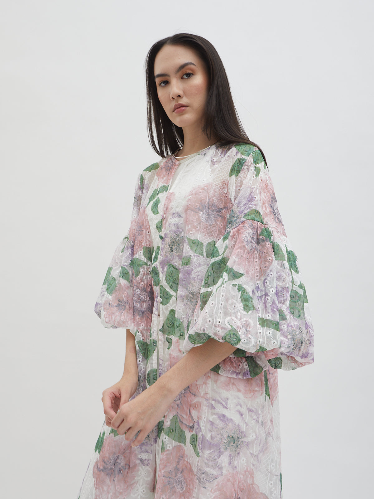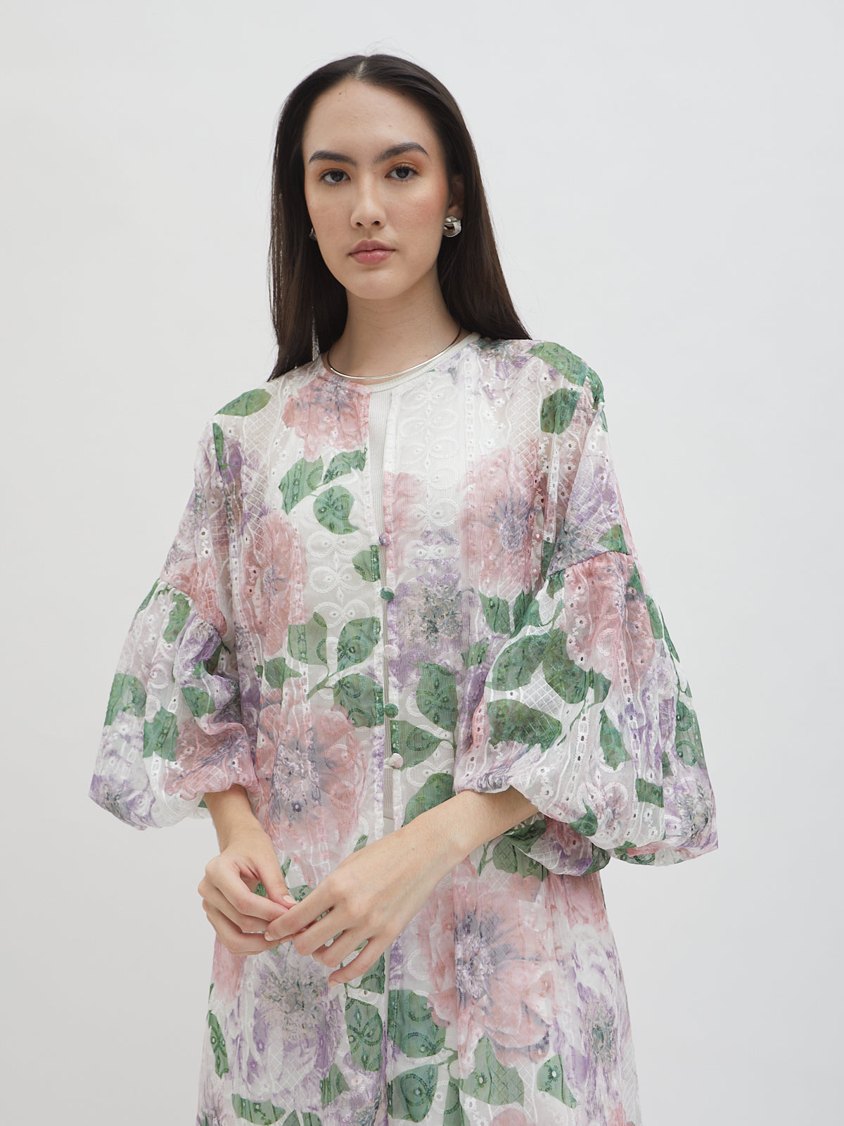 Lengan puff tiga perempat menambah kesan dramatis, sementara kancing depan membuatnya fleksibel untuk dikenakan terbuka atau tertutup. Tersedia dalam dua pilihan warna: Red dan Multi, cocok untuk berbagai gaya dan acara.