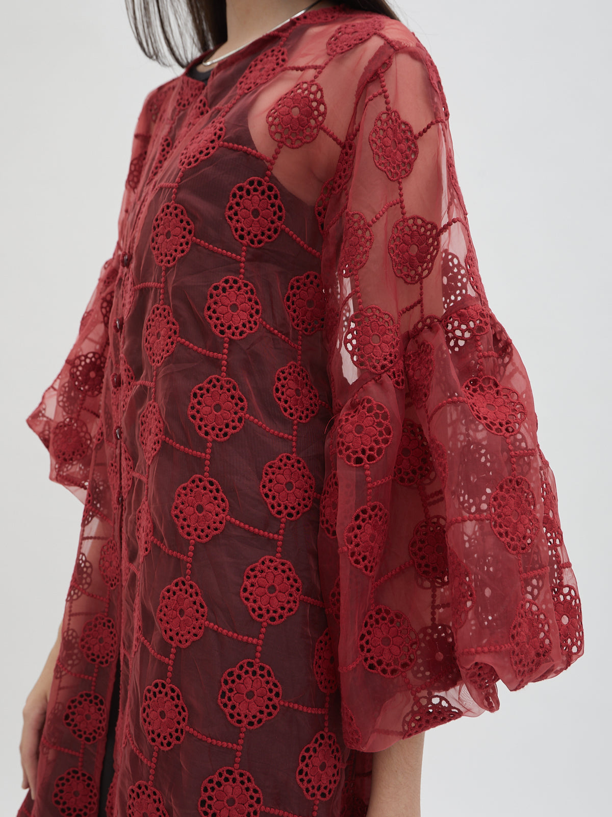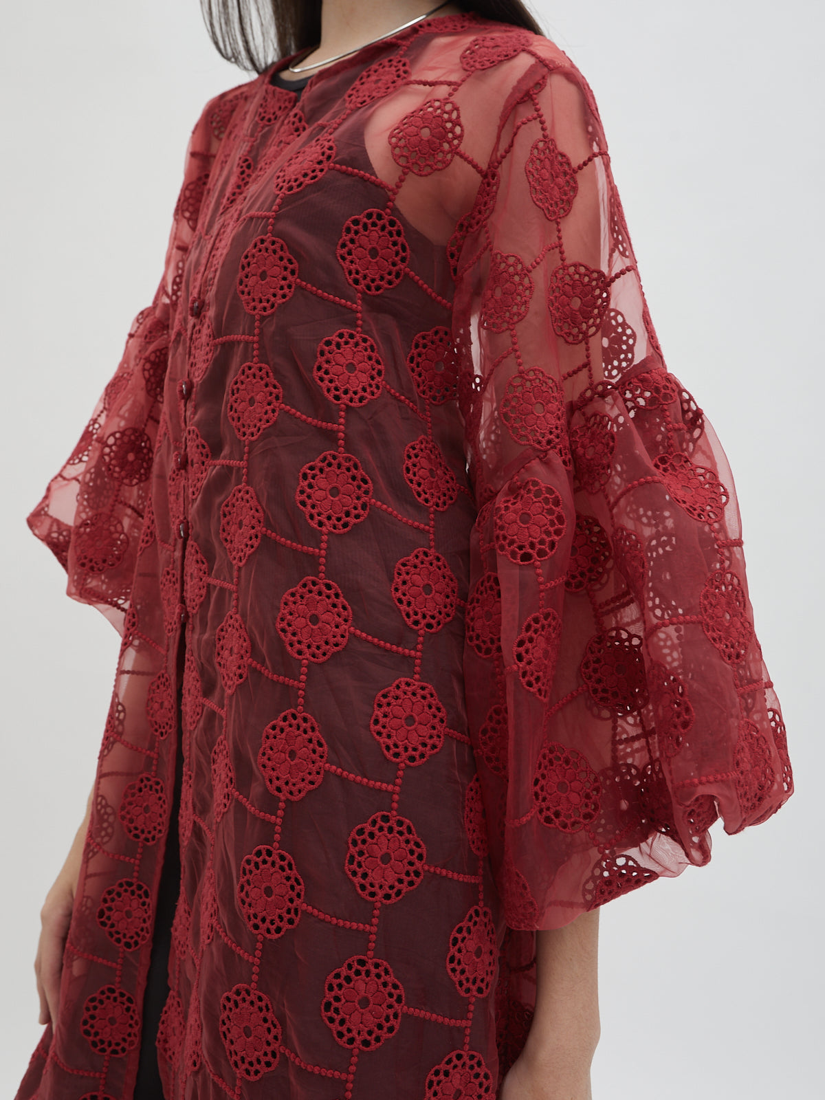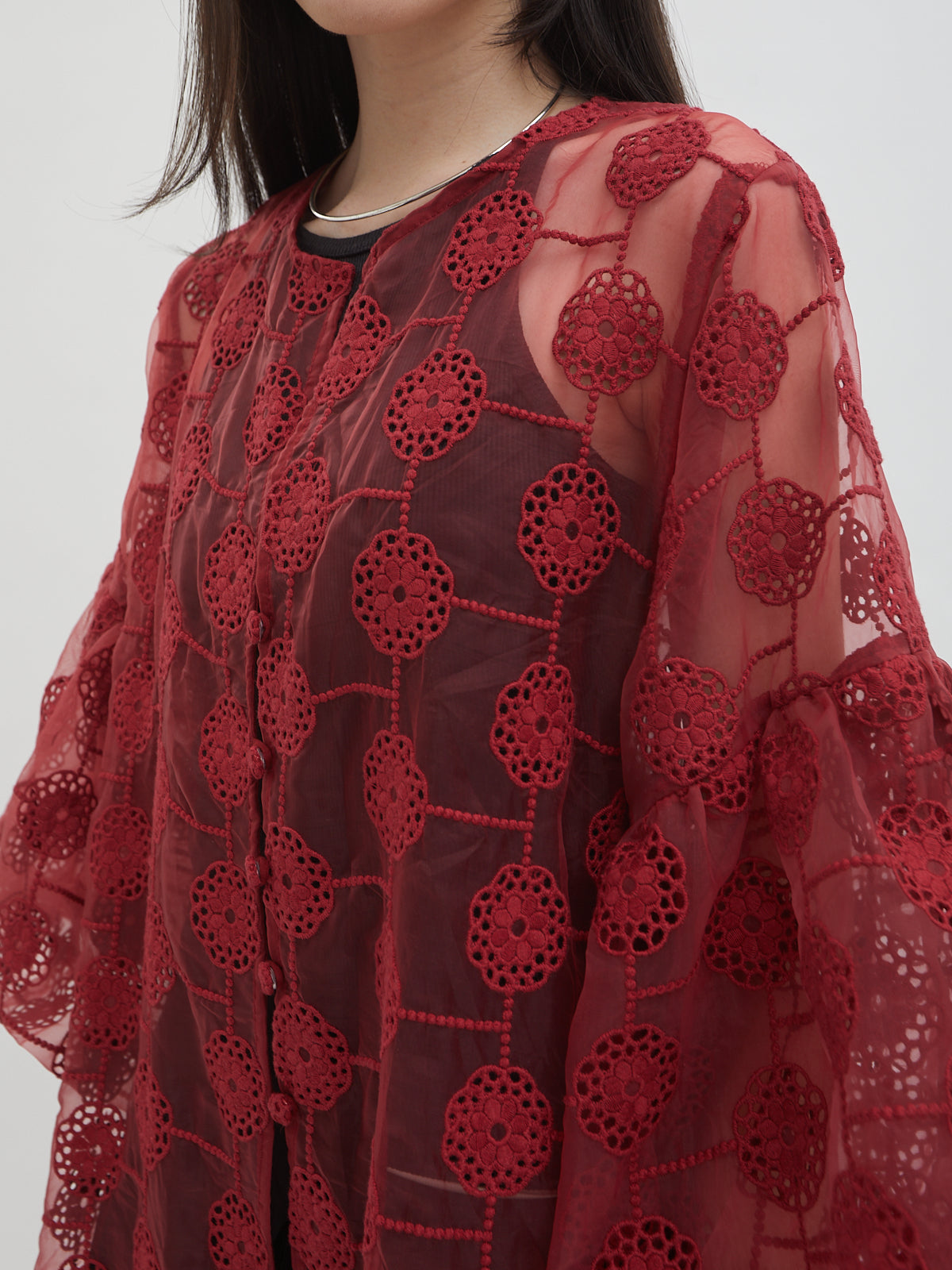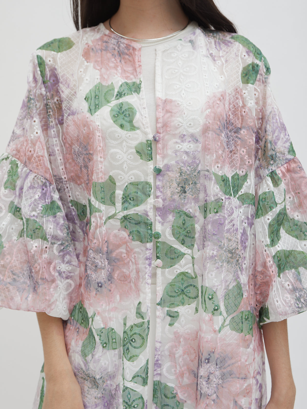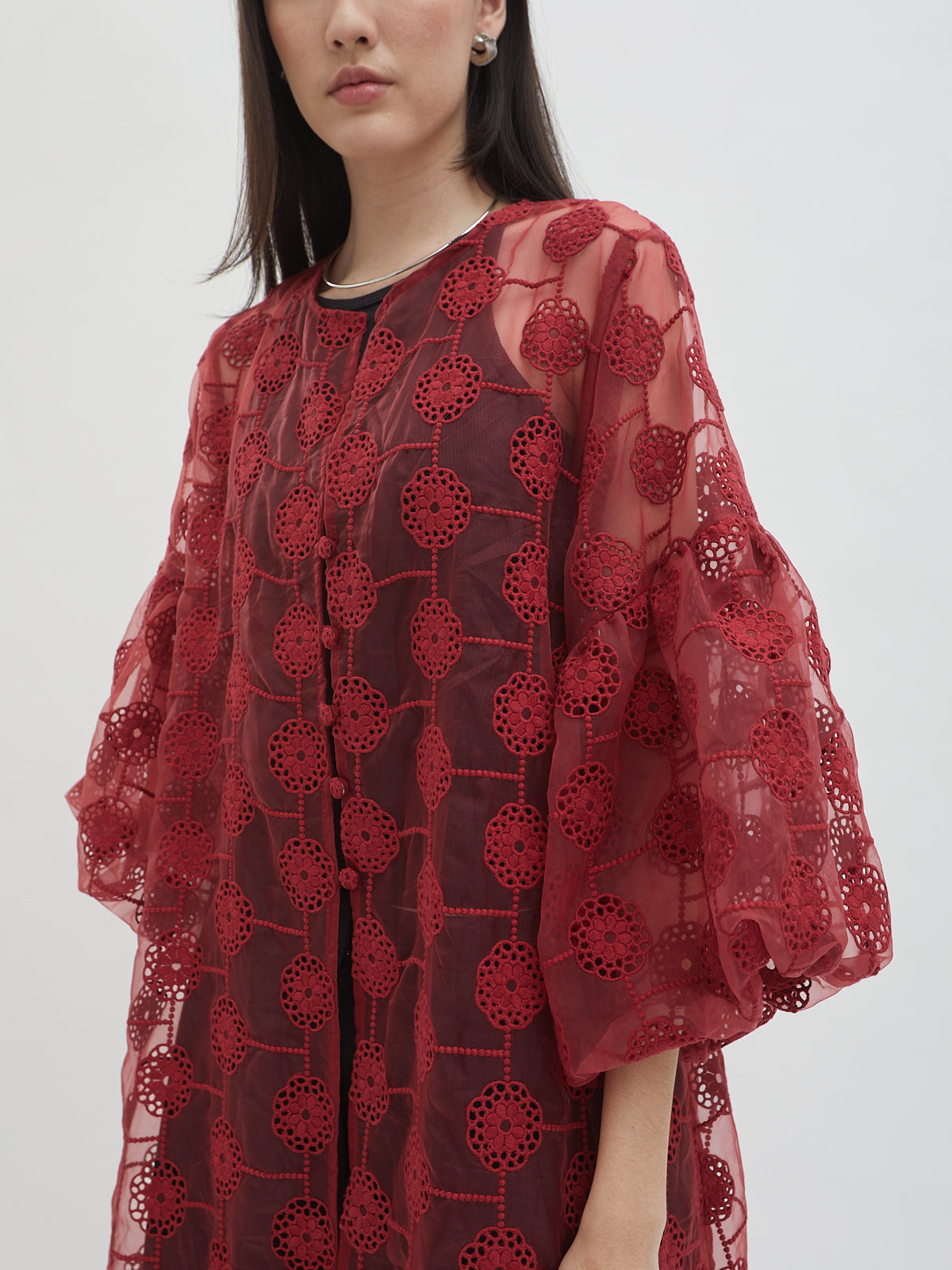 Lengan puff tiga perempat menambah kesan dramatis, sementara kancing depan membuatnya fleksibel untuk dikenakan terbuka atau tertutup. Tersedia dalam dua pilihan warna: Red dan Multi, cocok untuk berbagai gaya dan acara.