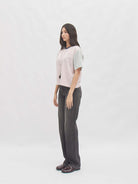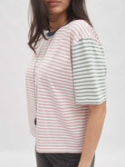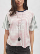 T-shirt dengan desain garis simpel yang memberikan kesan fresh dan timeless. Potongannya loose sehingga nyaman digunakan seharian tanpa membatasi gerak, cocok dipadukan dengan berbagai gaya kasual maupun semi-formal. Detail unik pada bagian lengan dengan kombinasi desain berbeda menambah sentuhan playful sekaligus modern, menjadikannya pilihan tepat untuk tampilan effortless namun tetap stylish.