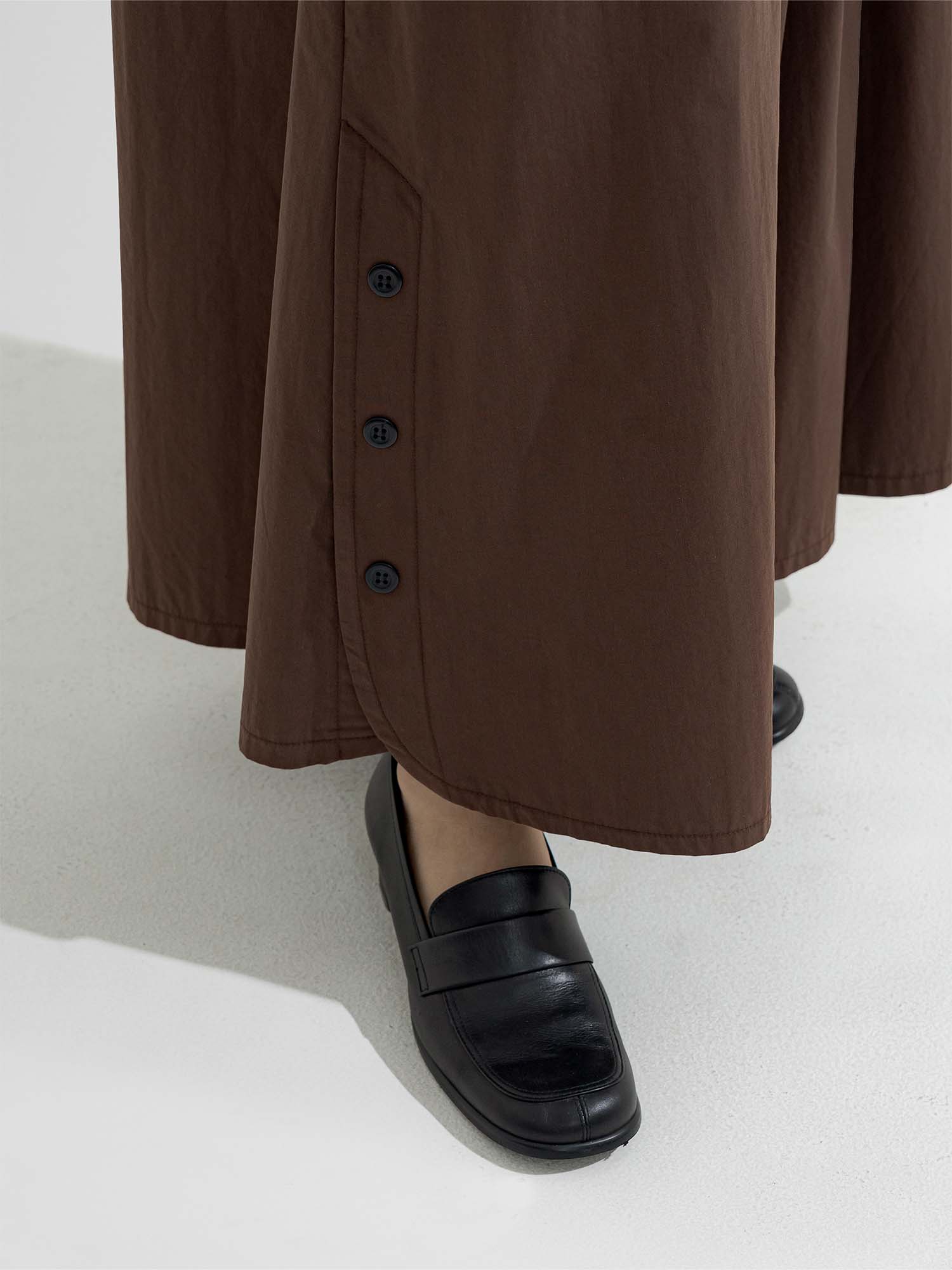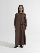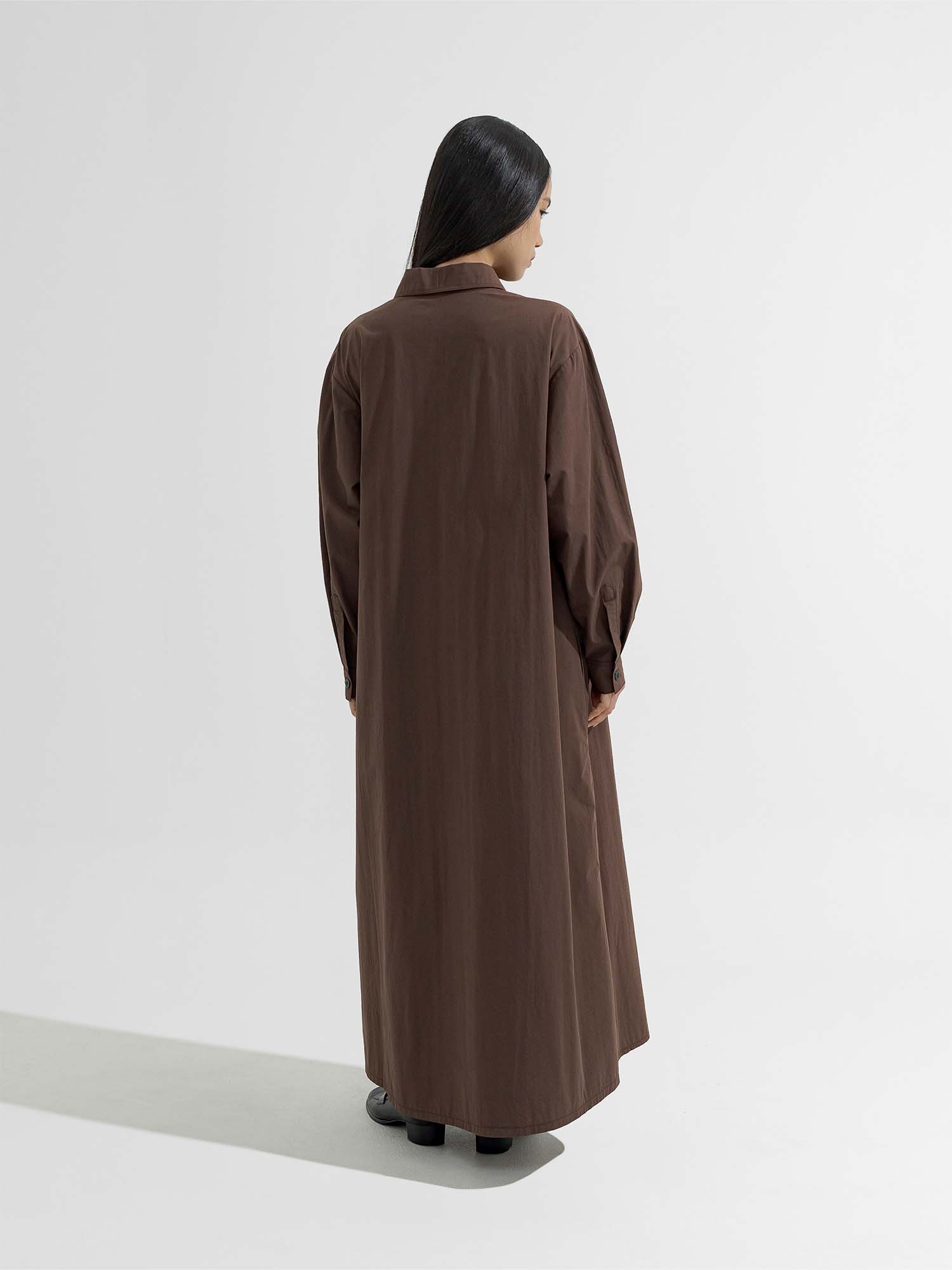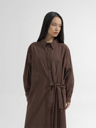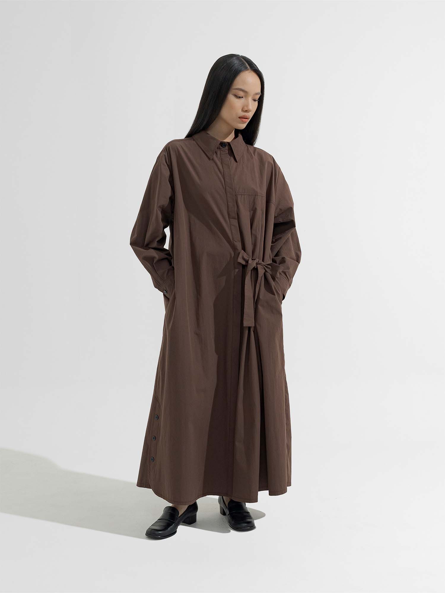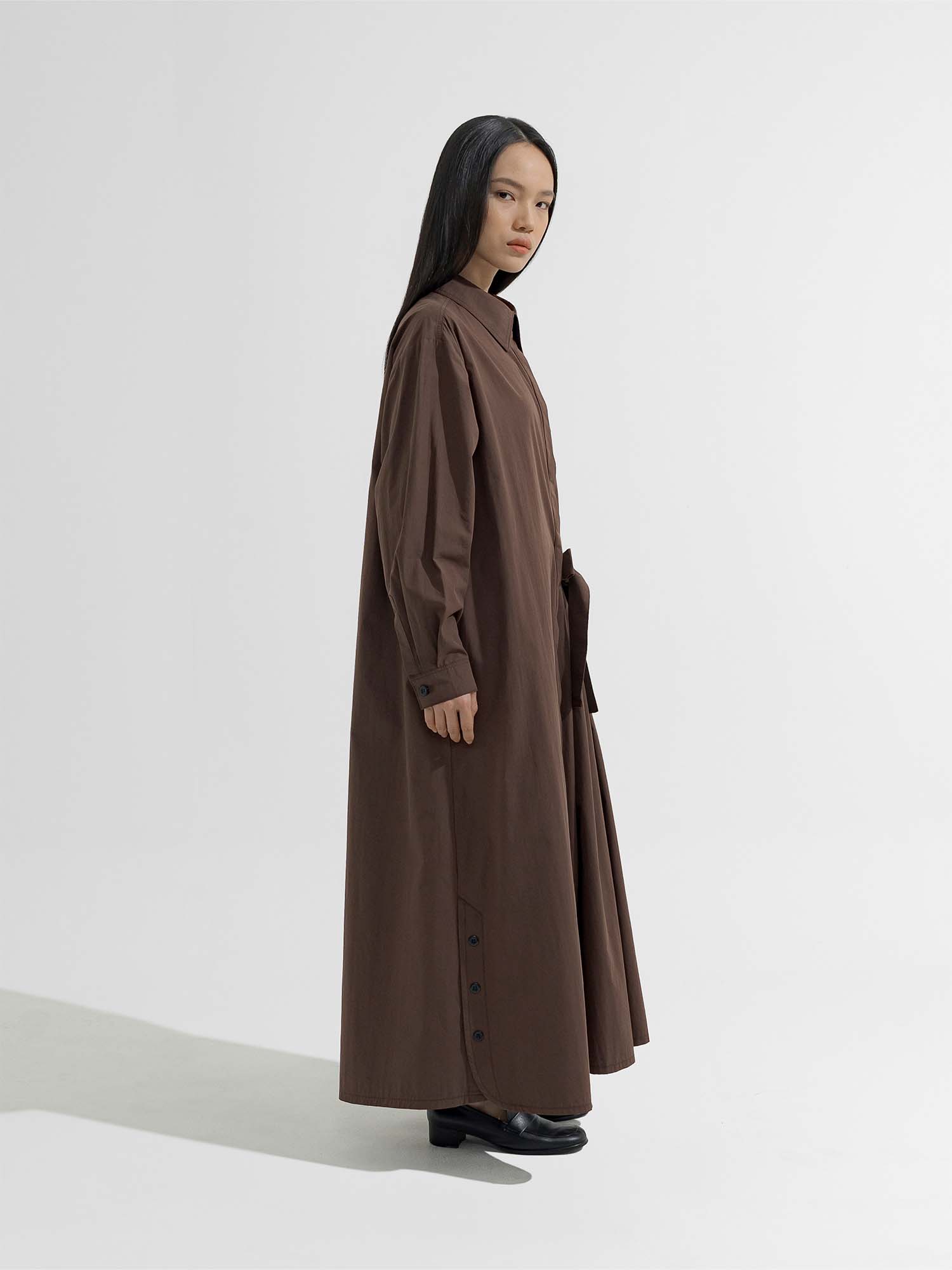 Long Cotton Shirt Dress dengan desain simple namun elegan. Detail kerah klasik, kancing depan tersembunyi, serta tambahan ikat pinggang memberi siluet lebih rapi dan feminin. Bagian bawah dihiasi detail kancing samping yang menambah aksen modern. Potongan panjang hingga mata kaki membuat dress ini nyaman dipakai sehari-hari maupun acara santai.
