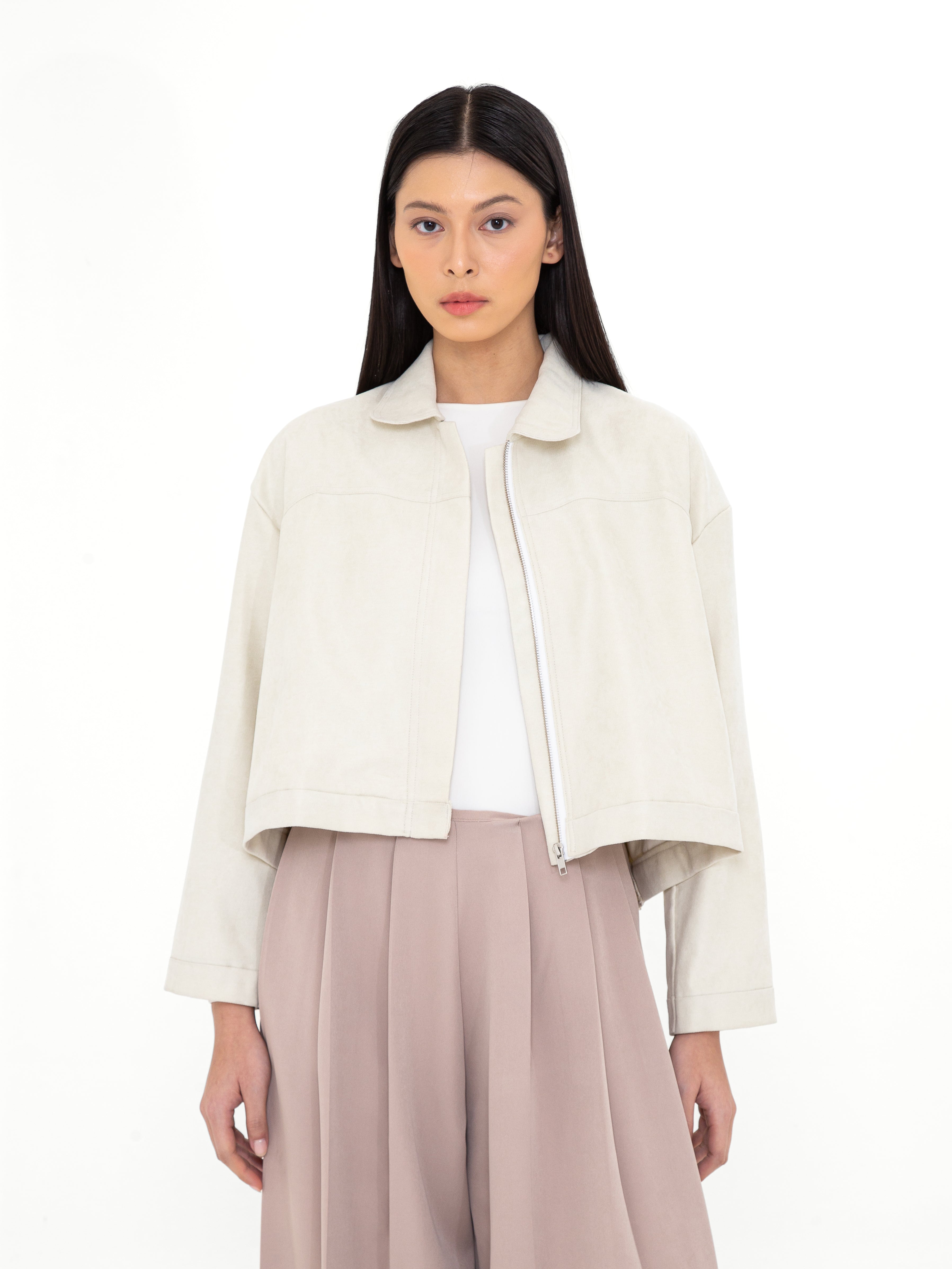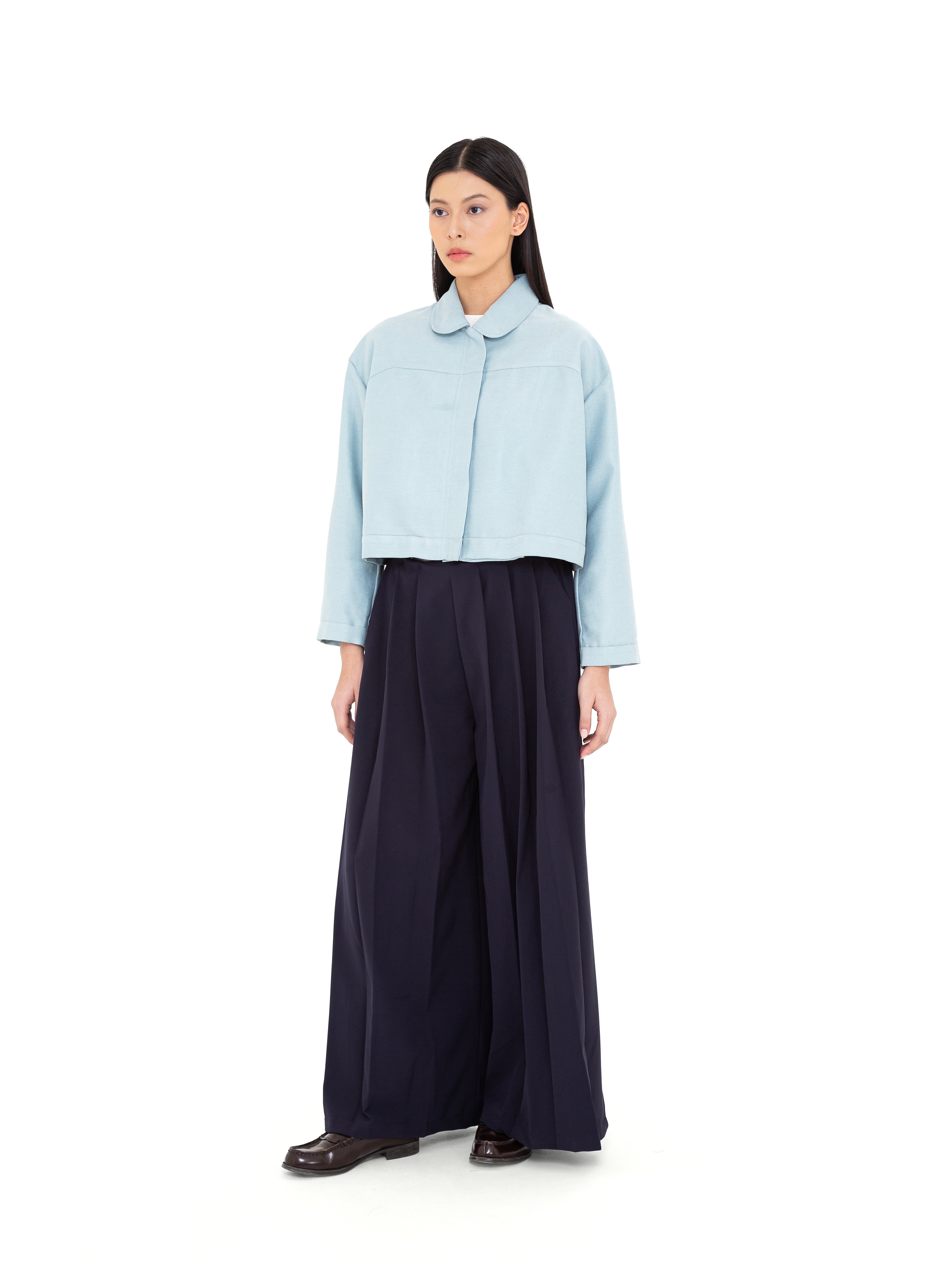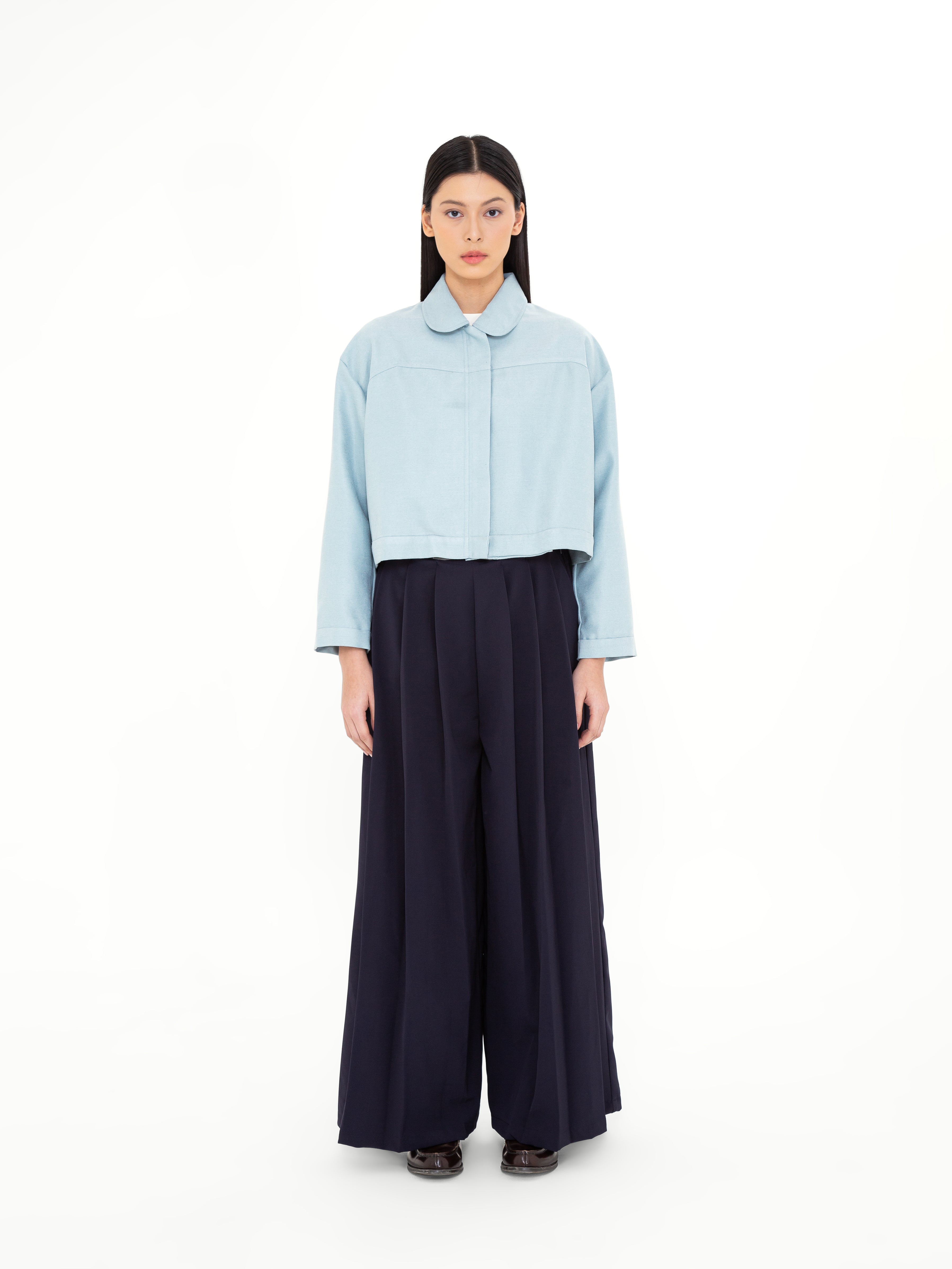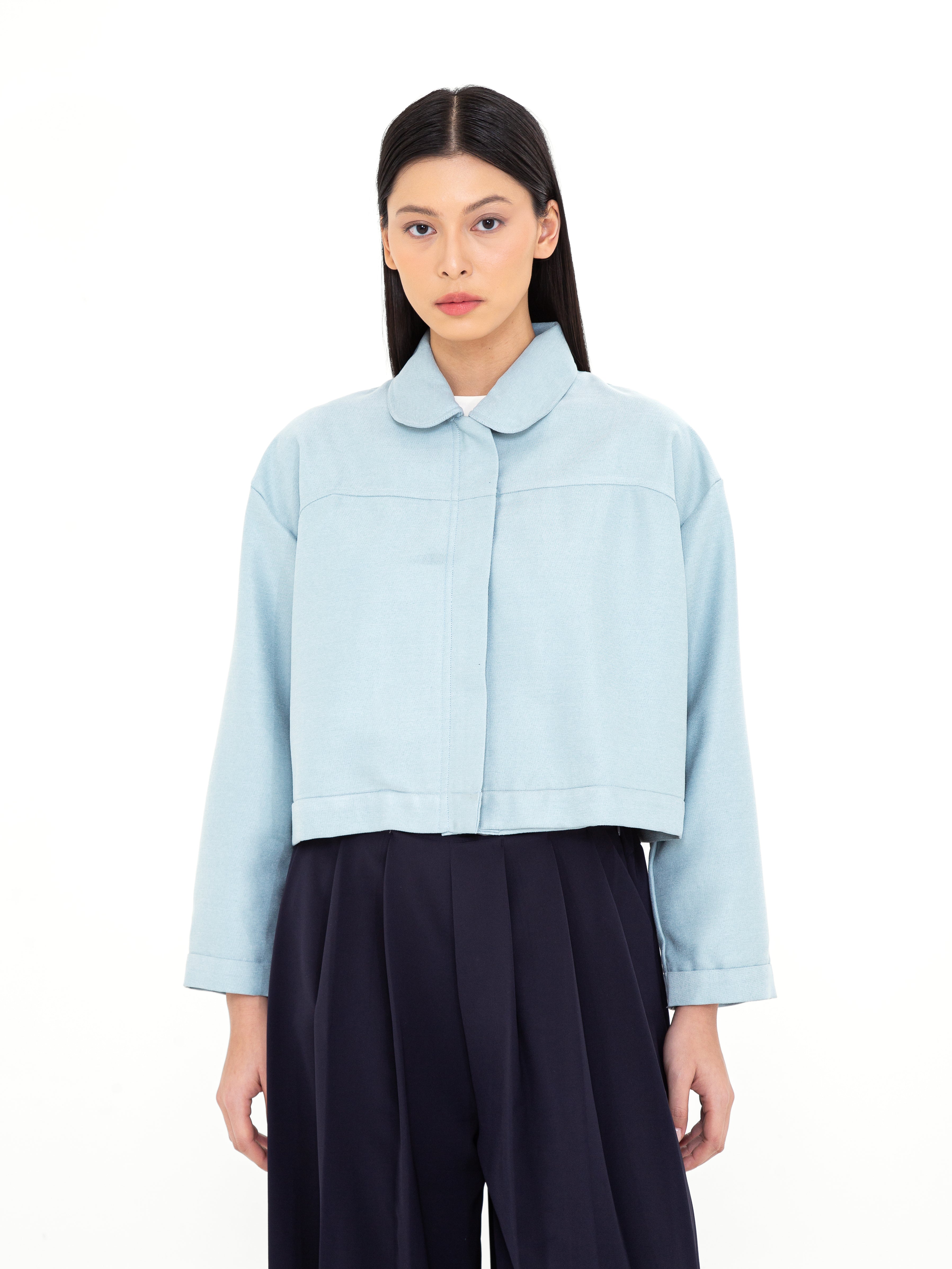Potongan cropped dengan siluet loose memberikan fleksibilitas dalam styling, sementara pilihan warna Ivory yang elegan dan Turquoise Blue yang subtle menjadikannya statement piece yang tetap versatile. Desainnya yang timeless dengan sentuhan modern membuat Crone Outer ideal untuk berbagai kesempatan, dari kasual hingga semi-formal.