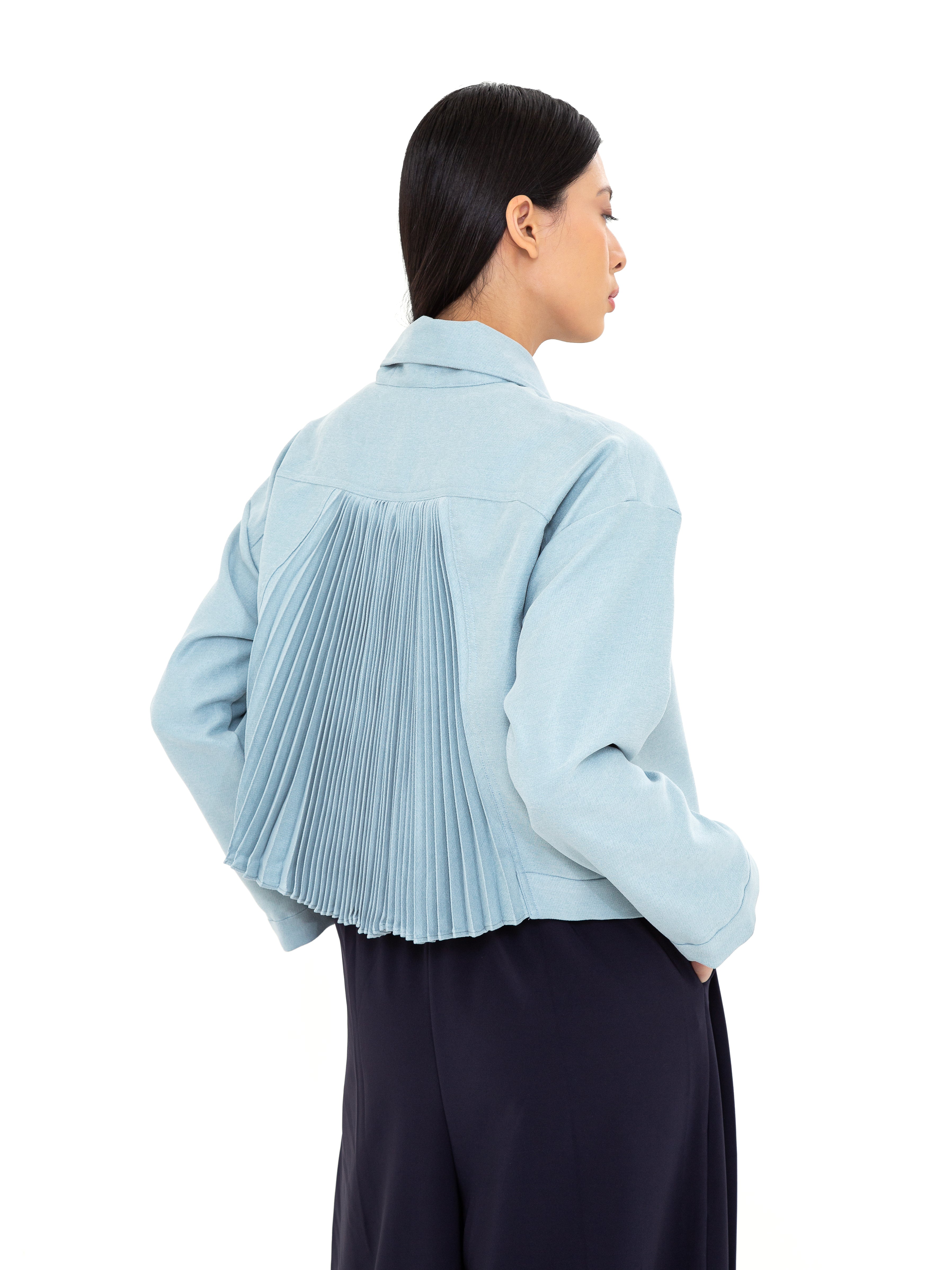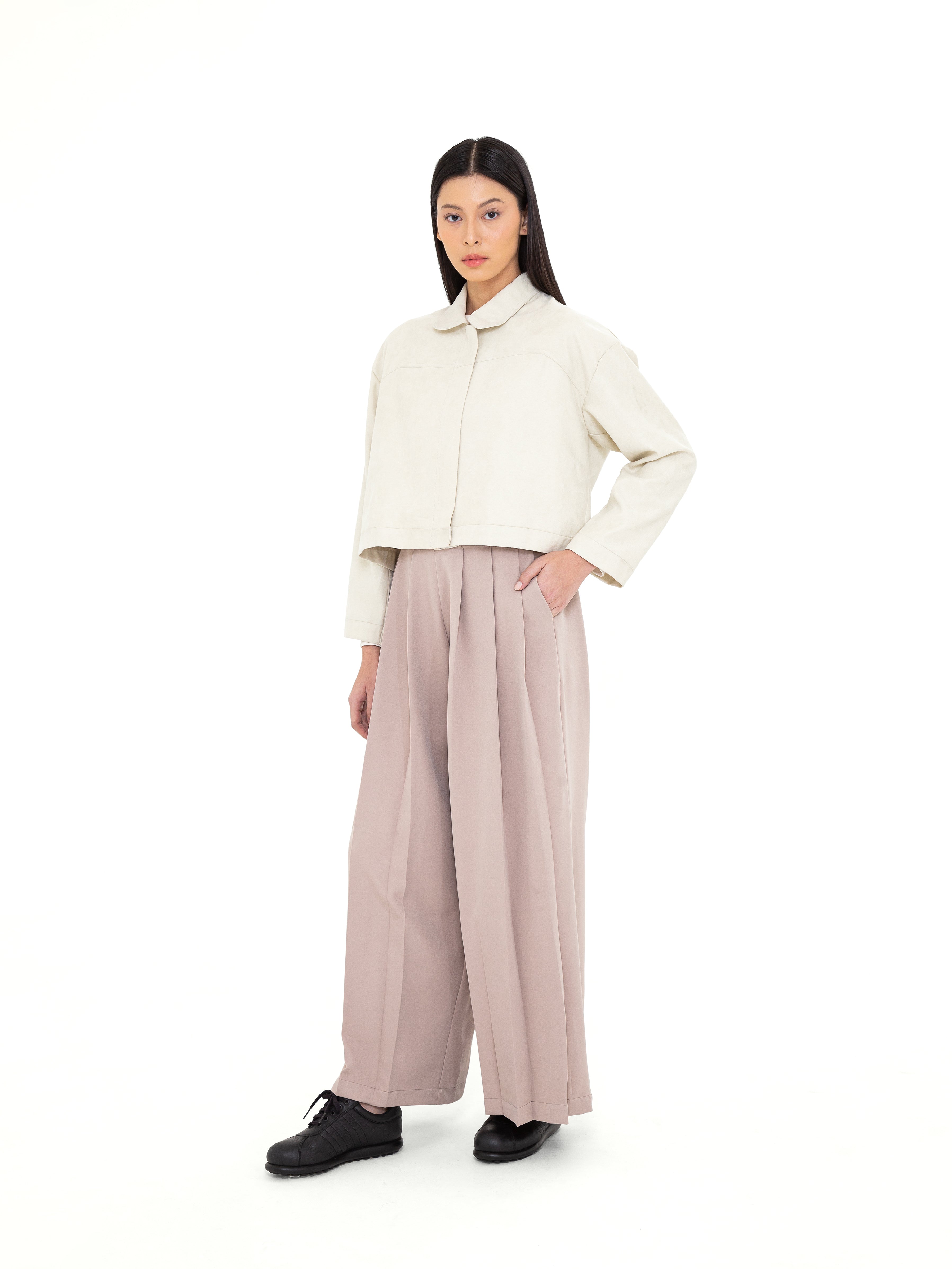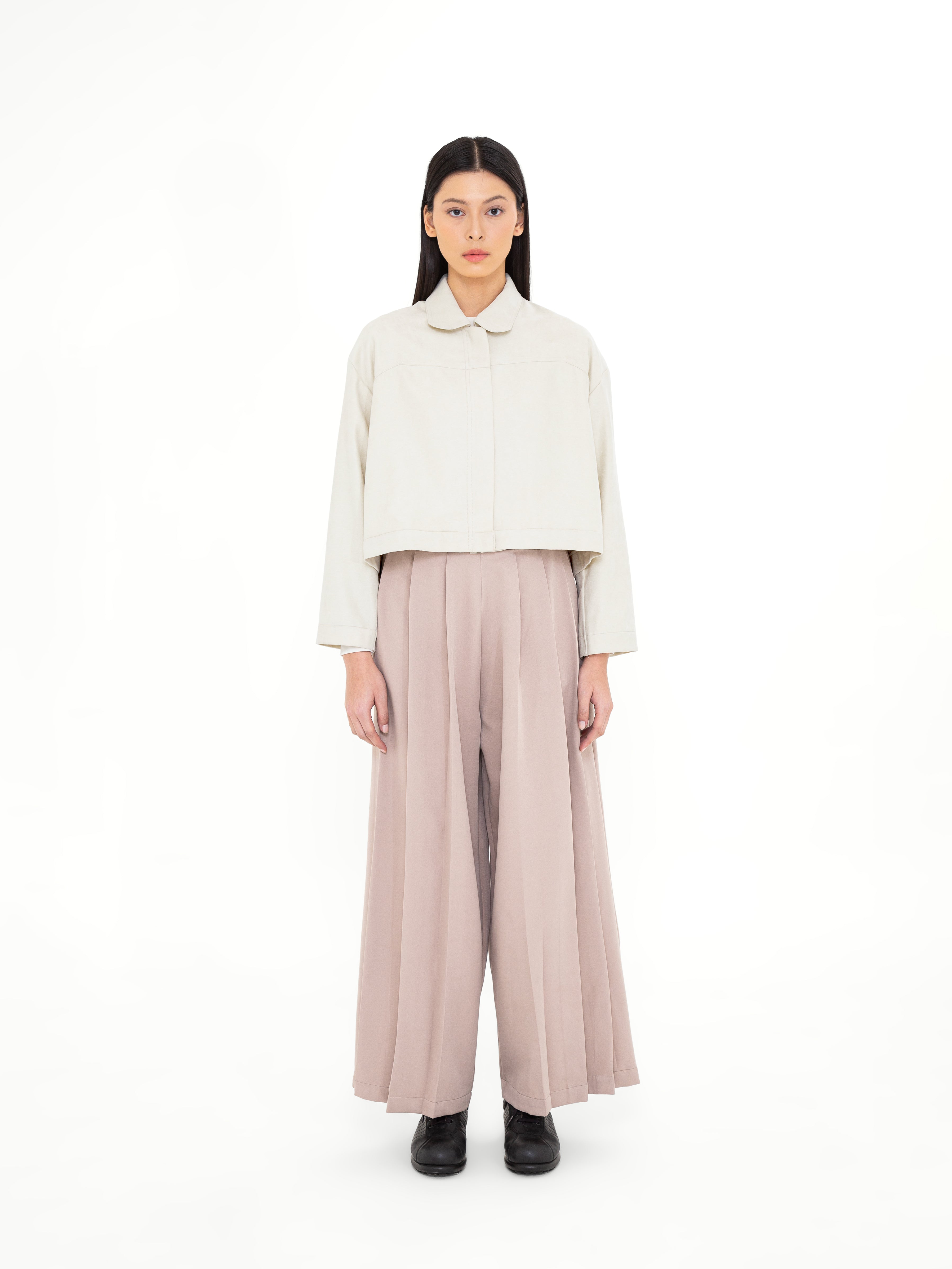 Potongan cropped dengan siluet loose memberikan fleksibilitas dalam styling, sementara pilihan warna Ivory yang elegan dan Turquoise Blue yang subtle menjadikannya statement piece yang tetap versatile. Desainnya yang timeless dengan sentuhan modern membuat Crone Outer ideal untuk berbagai kesempatan, dari kasual hingga semi-formal.