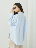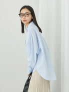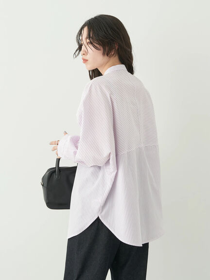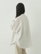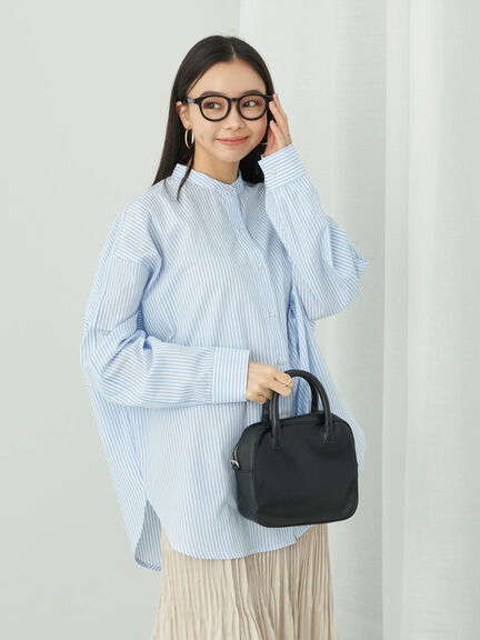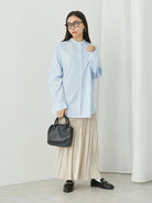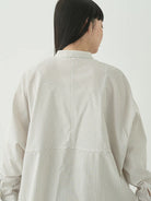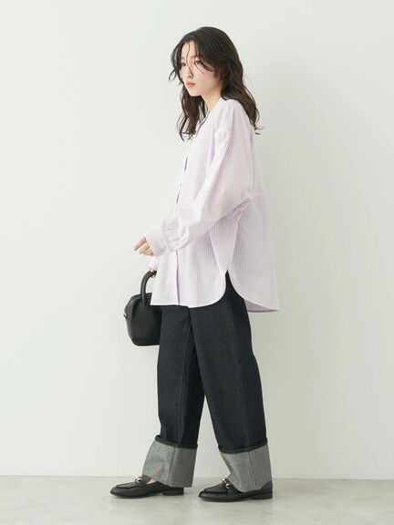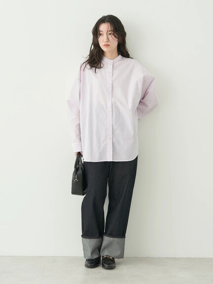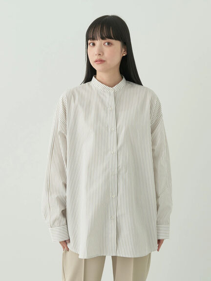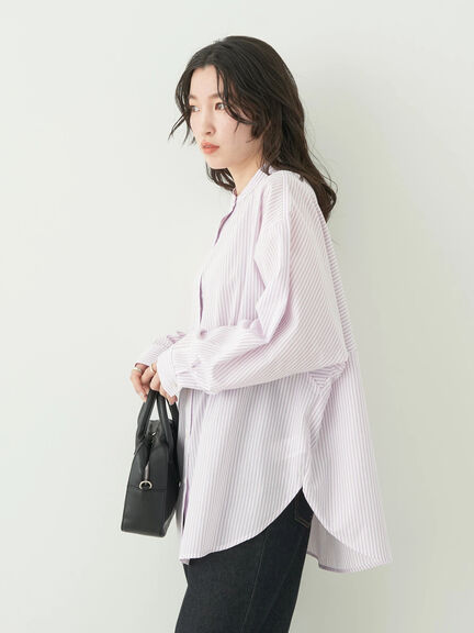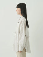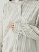 Kemeja wanita oversize ini di desain dengan bentuk kerah tegak serta motif garis-garis dan full kancing pada bagian depan, bisa dikenakan sebagai outer maupun kemeja biasa. Cocok untuk tampilan kasual atau formal.