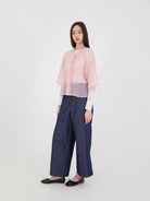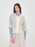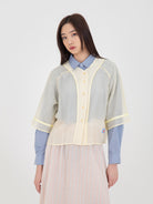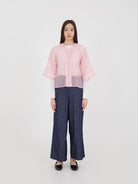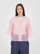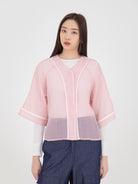 Blouse sheer oversized dengan desain loose fit yang memberikan kenyamanan maksimal sekaligus tampilan yang unik dan modern. Terbuat dari material yang ringan dan breathable, blouse ini cocok untuk layering dengan inner favorit. Detail piping pada bagian depan dan lengan memberikan aksen elegan yang membuat blouse ini tampak lebih menarik.