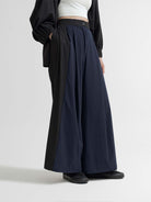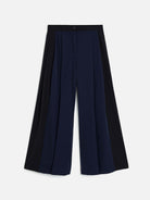 Celana kulot dua warna dengan potongan wide leg yang memberikan kesan modern dan elegan. Didesain dengan pleats lembut di bagian depan serta pinggang karet belakang untuk kenyamanan maksimal. Kombinasi warna kontras hitam dan navy menambah karakter, menjadikannya pilihan serbaguna untuk tampilan kasual hingga semi-formal.