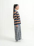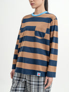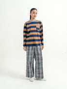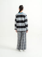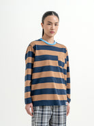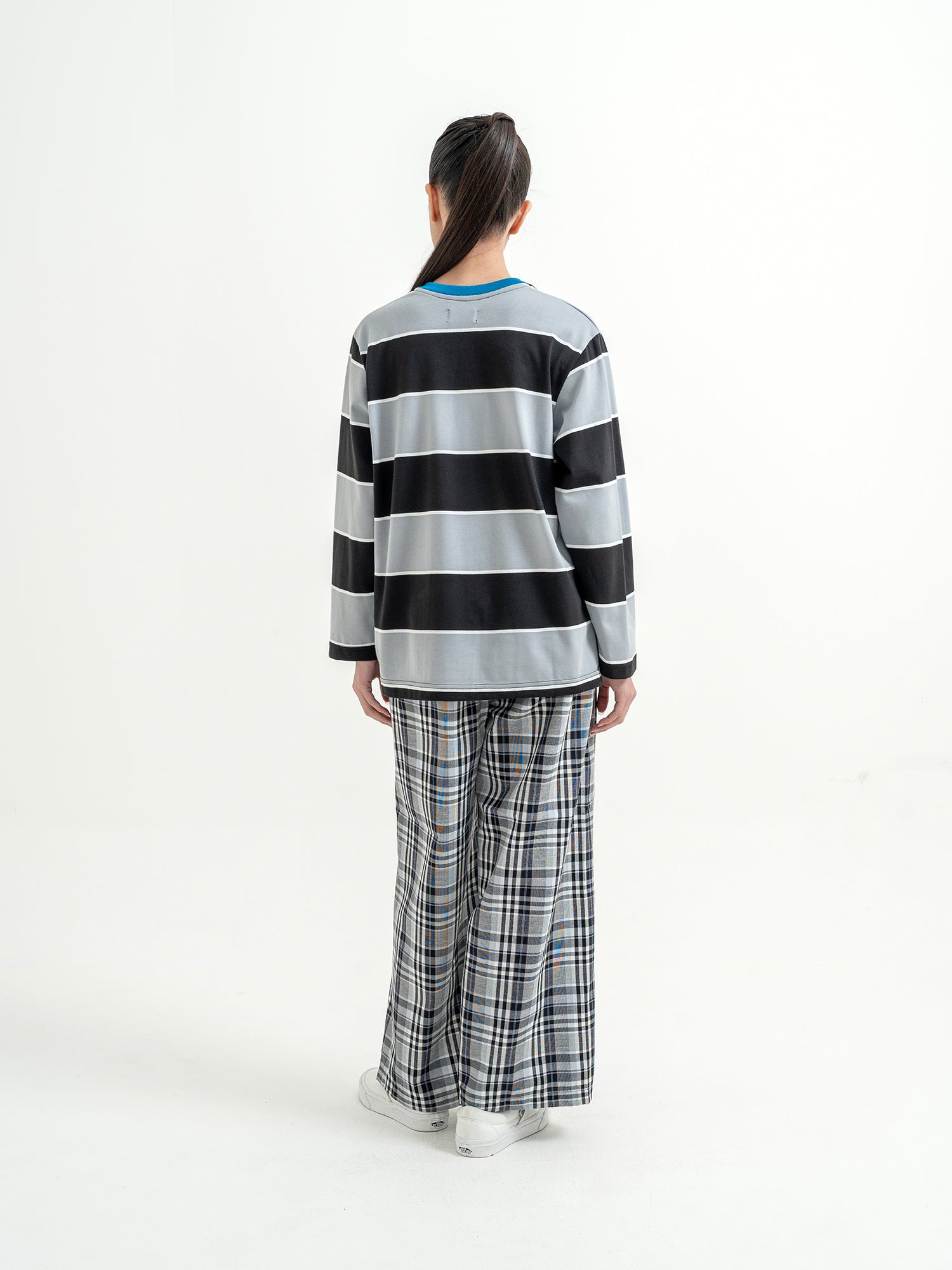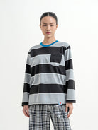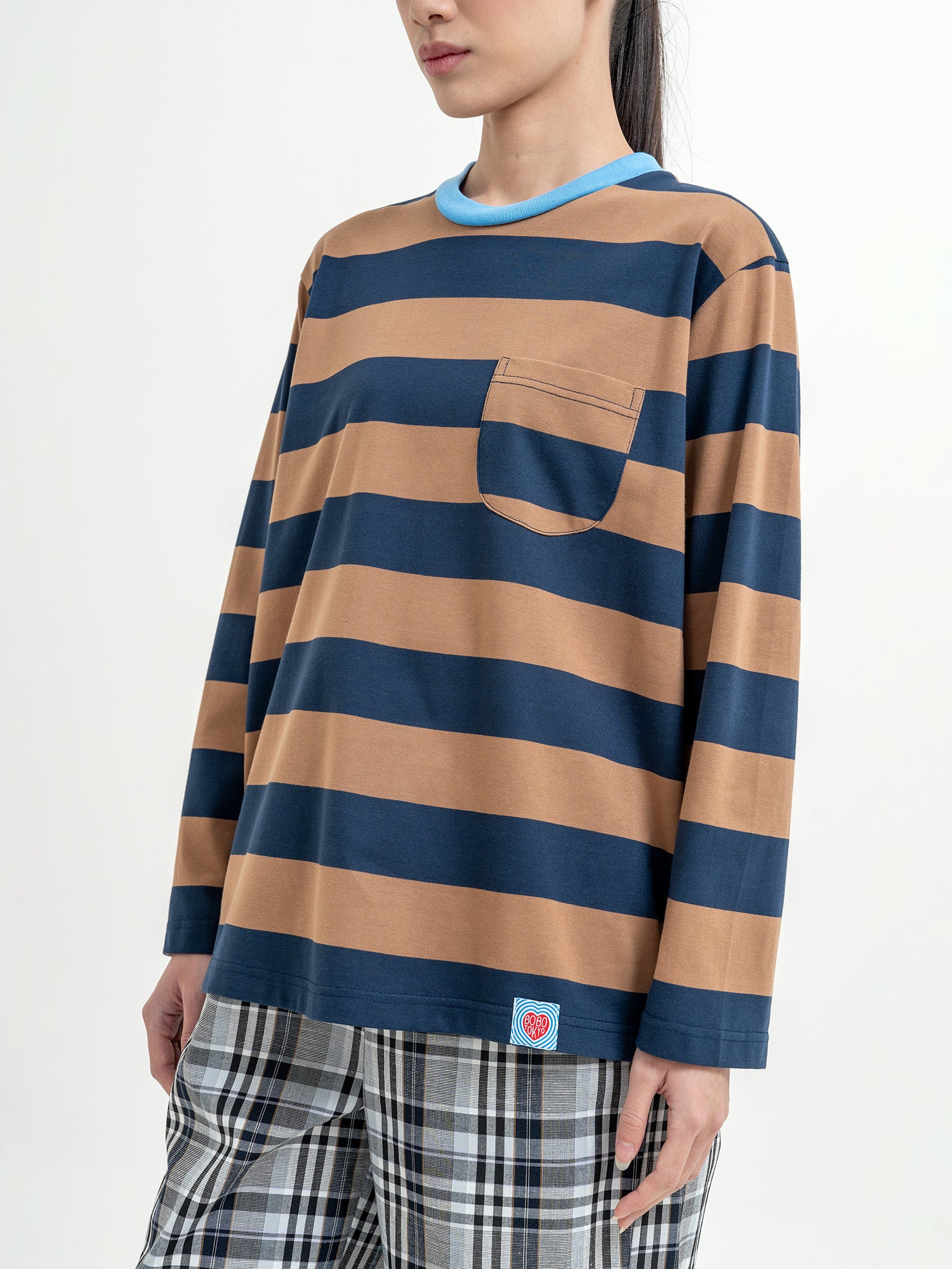 Atasan lengan panjang dengan motif garis lebar yang memberi tampilan bold dan playful. Detail aksen warna pada bagian leher serta kantong depan menambah karakter tanpa terlihat berlebihan. Potongan relaxed membuatnya nyaman dipakai untuk aktivitas harian dengan gaya kasual yang standout.