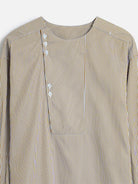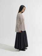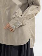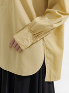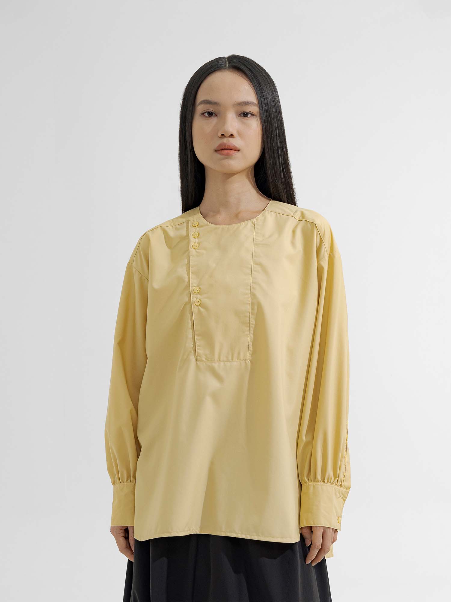 Blouse dengan desain unik dan detail placket kancing asimetris yang memberi sentuhan modern. Terbuat dari perpaduan superfine cotton dan modal, bahan terasa lembut, ringan, dan nyaman di kulit. Potongan longgar dengan detail manset kancing membuat blouse ini cocok untuk tampilan kasual chic maupun semi formal.