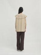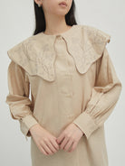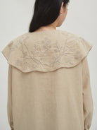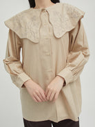 Blouse dengan siluet longgar yang nyaman dipakai sehari-hari. Dilengkapi detail embroidery pada kerah yang memberi sentuhan manis namun tetap terlihat clean. Desain lengan panjang dengan manset membuat tampilan lebih rapi dan mudah dipadukan untuk berbagai aktivitas, baik kasual maupun semi-formal.