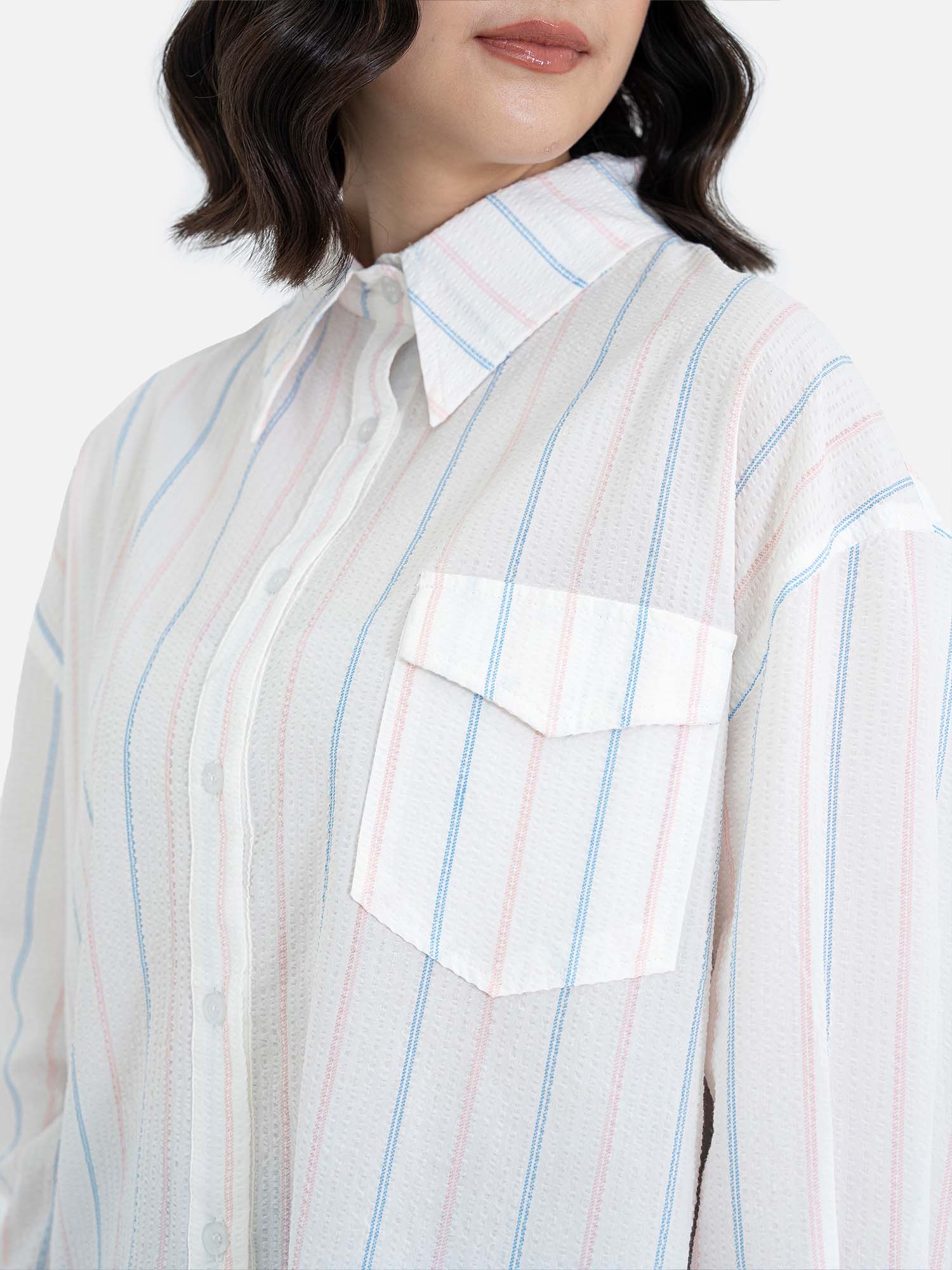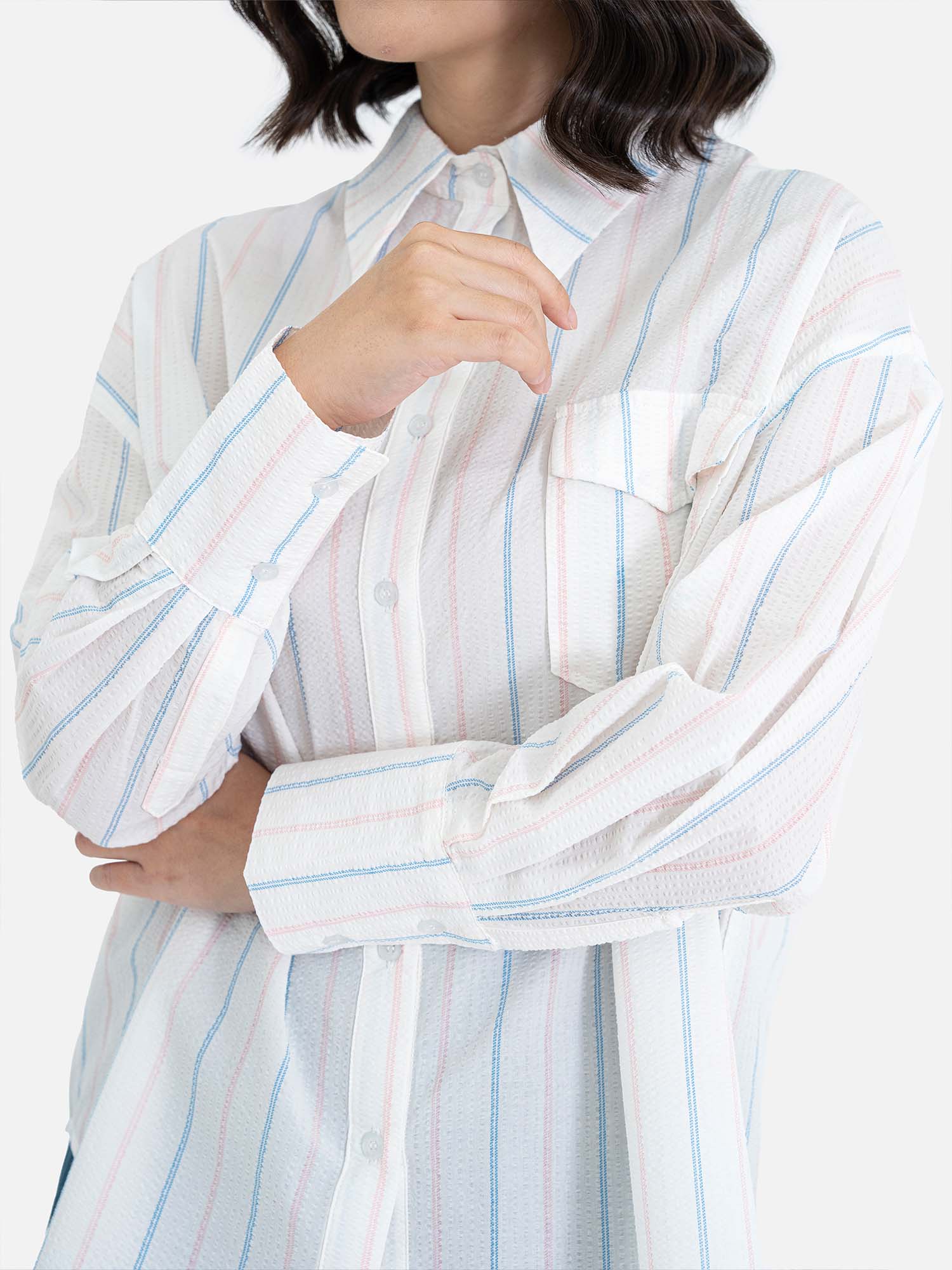Kemeja dengan potongan oversized yang nyaman dan stylish, terbuat dari 100% katun yang adem dan ringan. Cocok untuk tampilan kasual maupun semi-formal. Detail motif garis vertikal memberikan kesan clean dan modern.