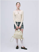 Added casual mood in twee. Adjustable shoulder strap and handle on top to carry by your hands. Carved carlyn logo on heart shape zipper puller. 1 zipper pocket outside, 1 open and zipper pocket inside.