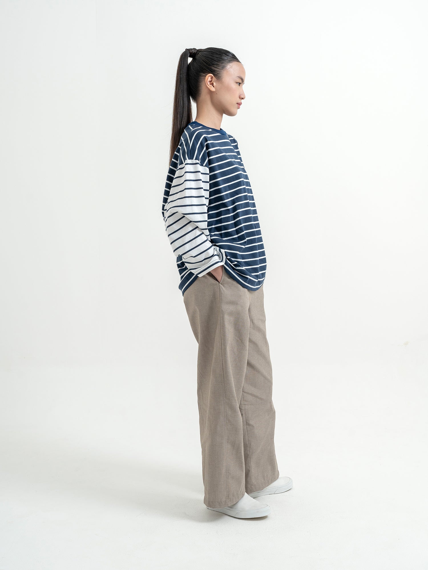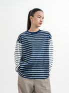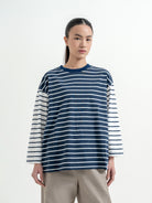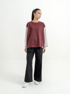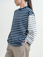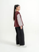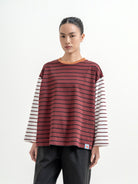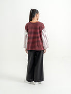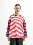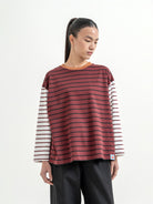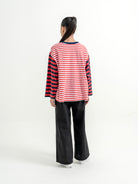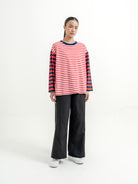Atasan stripe dengan desain kombinasi warna yang unik dan eye-catching. Potongan loose fit memberikan kesan santai dan nyaman dipakai sehari-hari. Detail garis yang berbeda di bagian badan dan lengan membuat tampilan lebih standout tanpa berlebihan—cocok untuk casual look yang effortless.