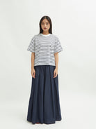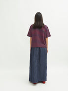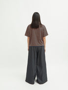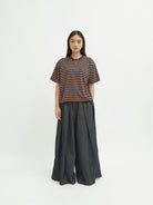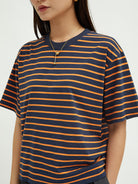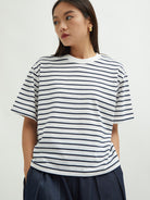 Kaos wanita lengan pendek ini didesain dengan siluet leher bulat. Memiliki model boxy dan motif stripe. Cocok dikenakan untuk acara sehari-hari.
