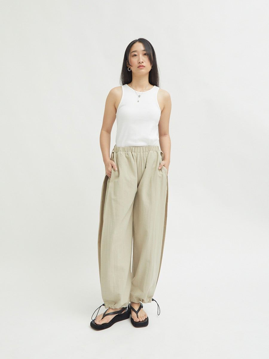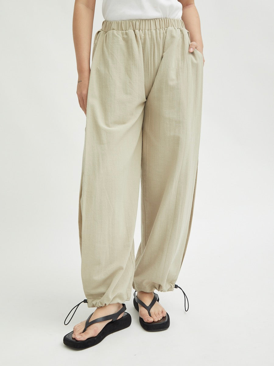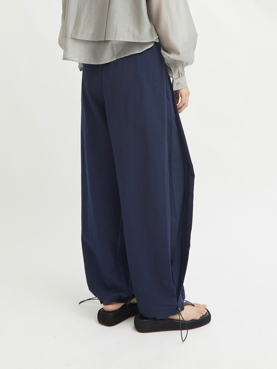 Celana panjang wanita ini didesain dengan dua fungsi. Terdapat karet di bagian pinggang. Tali pada lingkar kaki yang dapat disesuaikan memberikan kesan unik. Memiliki detail saku di sisi kanan dan kiri celana. Lipitan di bagian sisi membuat celana terlihat elegan. Cocok untuk dipakai acara formal maupun non formal.