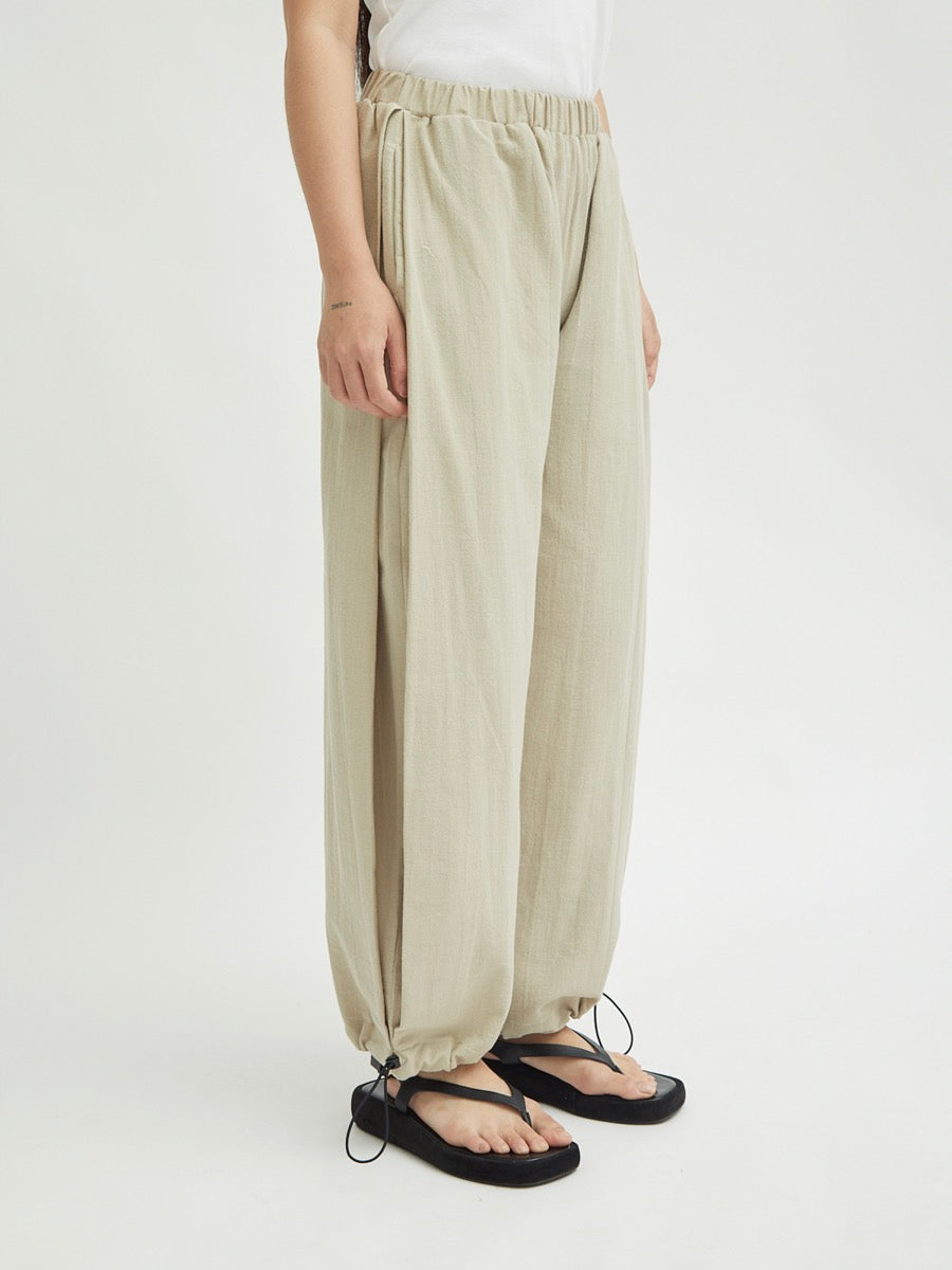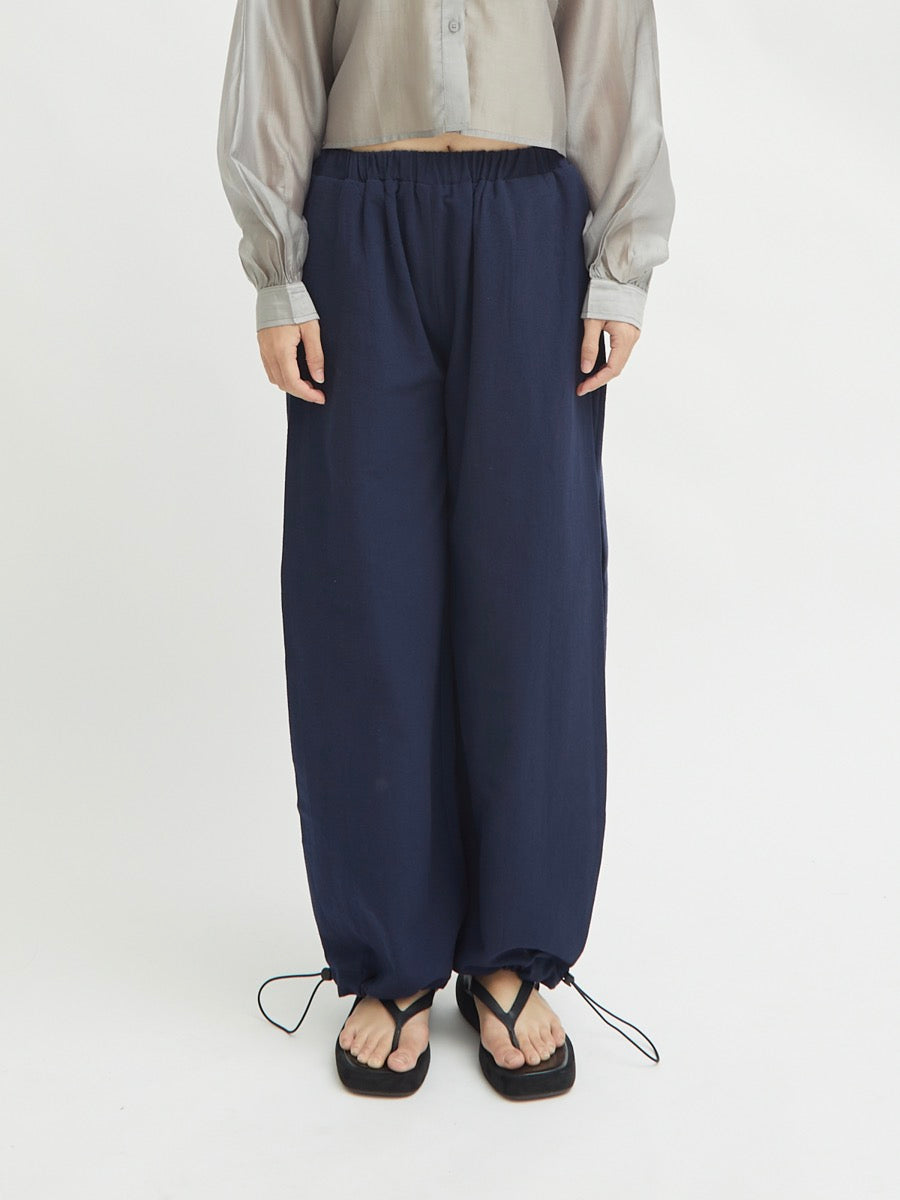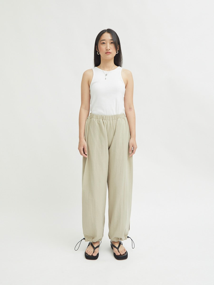Celana panjang wanita ini didesain dengan dua fungsi. Terdapat karet di bagian pinggang. Tali pada lingkar kaki yang dapat disesuaikan memberikan kesan unik. Memiliki detail saku di sisi kanan dan kiri celana. Lipitan di bagian sisi membuat celana terlihat elegan. Cocok untuk dipakai acara formal maupun non formal.