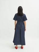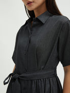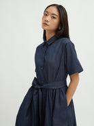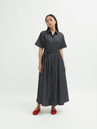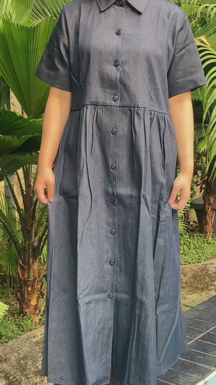 Dress wanita ini didesain dengan kerah kemeja dan full kancing di bagian depan. Memiliki tali pinggang yang dapat disesuaikan. Terdapat dua saku di bagian depan. Dapat dikenakan sebagai dress saja atau sebagai outer.